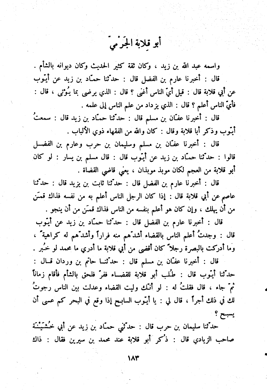 قَالَ: أَخْبَرَنَا عَفَّانُ بْنُ مُسْلِمٍ قَالَ: حَدَّثَنَا حَمَّادُ بْنُ زَيْدٍ قَالَ: سَمِعْتُ أَيُّوبَ، وَذَكَرَ أَبَا قِلَابَةَ، وَقَالَ: «§كَانَ وَاللَّهِ مِنَ الْفُقَهَاءِ ذَوِي الْأَلْبَابِ»