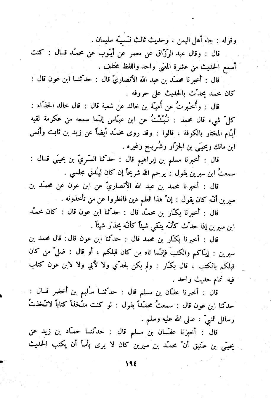 قَالَ: أَخْبَرَنَا مُحَمَّدُ بْنُ عَبْدِ اللَّهِ الْأَنْصَارِيُّ قَالَ: حَدَّثَنَا ابْنُ عَوْنٍ قَالَ: «§كَانَ مُحَمَّدٌ يُحَدِّثُ بِالْحَدِيثِ عَلَى حُرُوفِهِ»
