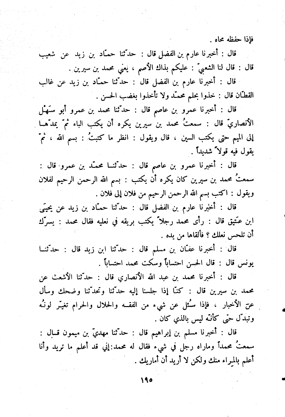 قَالَ: أَخْبَرَنَا عَمْرُو بْنُ عَاصِمٍ قَالَ: حَدَّثَنَا مُحَمَّدُ بْنُ عَمْرٍو أَبُو سَهْلٍ الْأَنْصَارِيُّ قَالَ: سَمِعْتُ مُحَمَّدَ بْنَ سِيرِينَ يَكْرَهُ أَنْ يَكْتُبَ الْبَاءَ، ثُمَّ يَمُدَّهَا إِلَى الْمِيمِ حَتَّى يَكْتُبَ السِّينَ قَالَ: وَيَقُولُ: " §انْظُرْ مَا كَتَبْتُ: بِسْمِ اللَّهِ " ثُمَّ يَقُولُ فِيهِ قَوْلًا شَدِيدًا