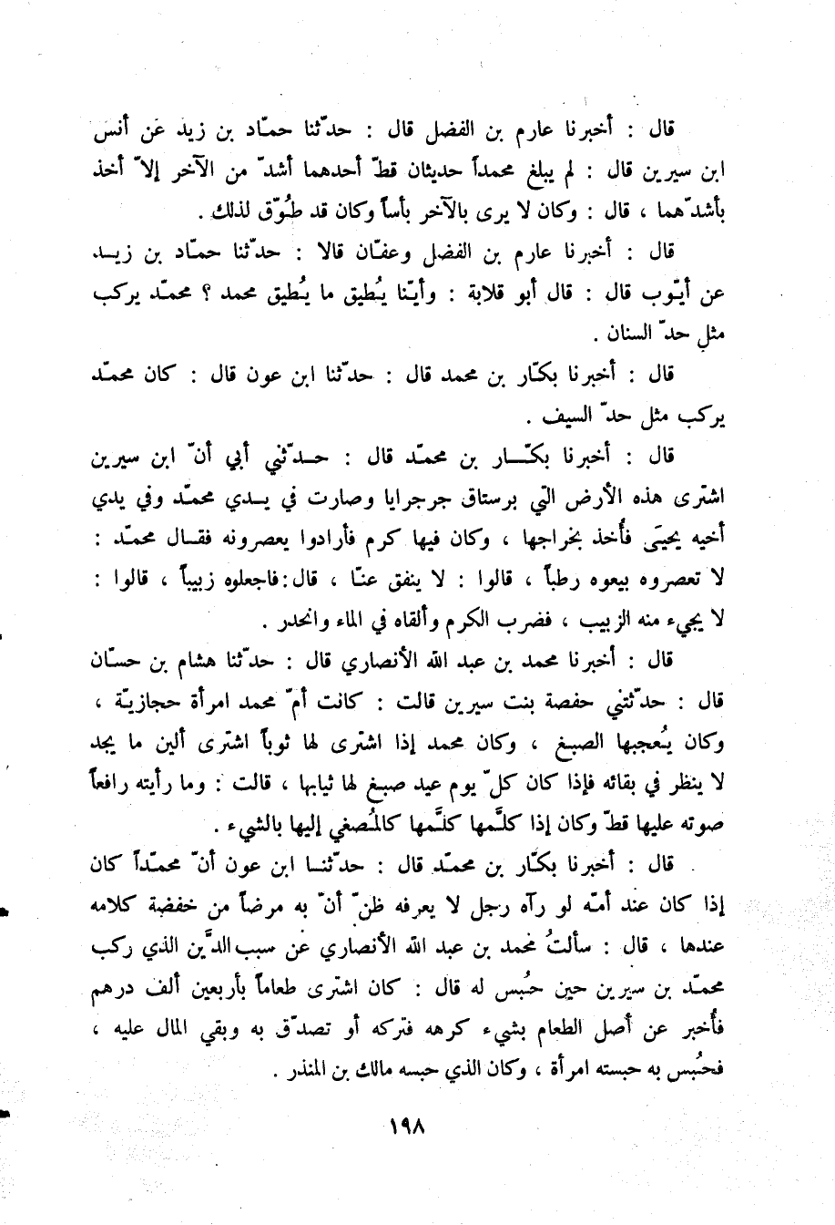 قَالَ: سَأَلْتُ مُحَمَّدَ بْنَ عَبْدِ اللَّهِ الْأَنْصَارِيَّ عَنْ سَبَبِ الدَّيْنِ الَّذِي رَكِبَ مُحَمَّدَ بْنَ سِيرِينَ حِينَ حُبِسَ لَهُ قَالَ: «كَانَ §اشْتَرَى طَعَامًا بِأَرْبَعِينَ أَلْفَ دِرْهَمٍ، فَأُخْبِرَ عَنْ أَصْلِ الطَّعَامِ بِشَيْءٍ كَرِهَهُ، فَتَرَكَهُ، أَوْ تَصَدَّقَ بِهِ، وَبَقِيَ الْمَالُ عَلَيْهِ، فَحُبِسَ بِهِ، حَبَسَتْهُ امْرَأَةٌ، وَكَانَ الَّذِي حَبَسَهُ مَالِكُ بْنُ دِينَارٍ»