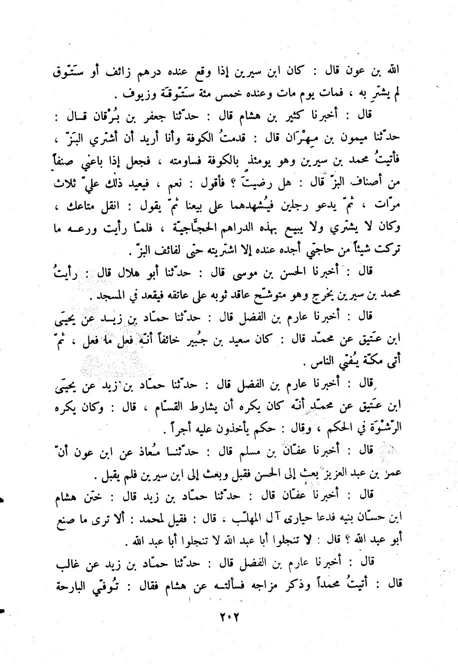 قَالَ: أَخْبَرَنَا كَثِيرُ بْنُ هِشَامٍ قَالَ: حَدَّثَنَا جَعْفَرُ بْنُ بُرْقَانَ قَالَ: حَدَّثَنَا مَيْمُونُ بْنُ مِهْرَانَ قَالَ: قَدِمْتُ الْكُوفَةَ وَأَنَا أُرِيدُ أَنْ أَشْتَرِيَ الْبَزَّ، فَأَتَيْتُ مُحَمَّدَ بْنَ سِيرِينَ وَهُوَ يَوْمَئِذٍ بِالْكُوفَةِ، فَسَاوَمْتُهُ، فَجَعَلَ إِذَا بَاعَنِي صِنْفًا مِنْ أَصْنَافِ الْبَزِّ قَالَ: §هَلْ رَضِيتَ؟ فَأَقُولُ: نَعَمْ، فَيُعِيدُ ذَلِكَ عَلَيَّ ثَلَاثَ مَرَّاتٍ، ثُمَّ يَدْعُو رَجُلَيْنِ، فَيُشْهِدُهُمَا عَلَى بَيْعِنَا، ثُمَّ يَقُولُ: انْقُلْ مَتَاعَكَ وَكَانَ لَا يَشْتَرِي وَلَا يَبِيعُ بِهَذِهِ الدَّرَاهِمِ الْحَجَّاجِيَّةِ، فَلَمَّا رَأَيْتُ وَرَعَهُ مَا تَرَكْتُ شَيْئًا مِنْ حَاجَتِي أَجِدُهُ عِنْدَهُ إِلَّا اشْتَرَيْتُهُ حَتَّى لَفَائِفَ الْبَزِّ "