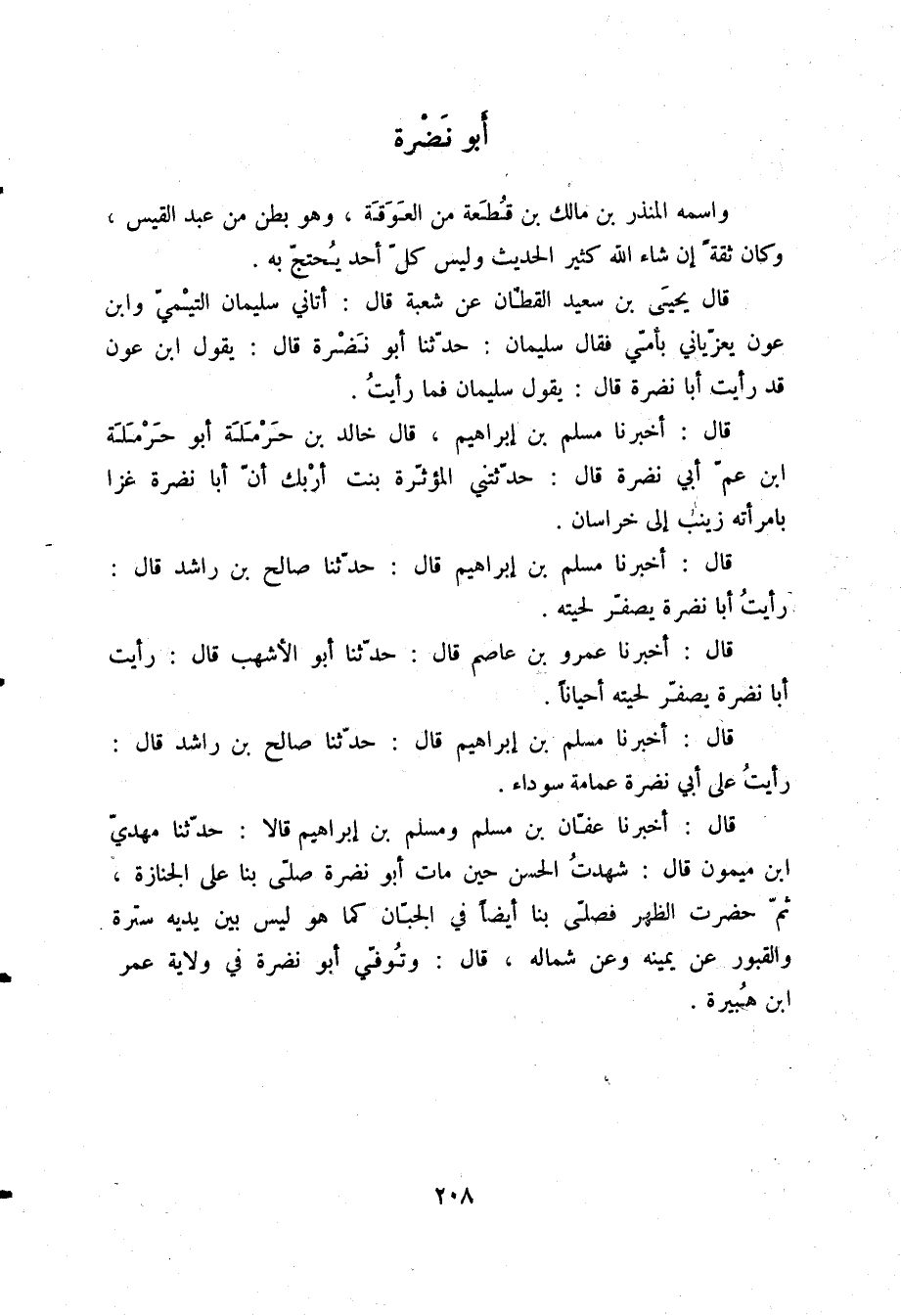 §أَبُو نَضْرَةَ وَاسْمُهُ الْمُنْذِرُ بْنُ مَالِكِ بْنِ قُطَعَةَ مِنَ الْعَوَقَةِ، وَهُوَ بَطْنٌ مِنْ عَبْدِ الْقَيْسِ، وَكَانَ ثِقَةً إِنْ شَاءَ اللَّهُ، كَثِيرَ الْحَدِيثِ وَلَيْسَ كُلُّ أَحَدٍ يُحْتَجُّ بِهِ