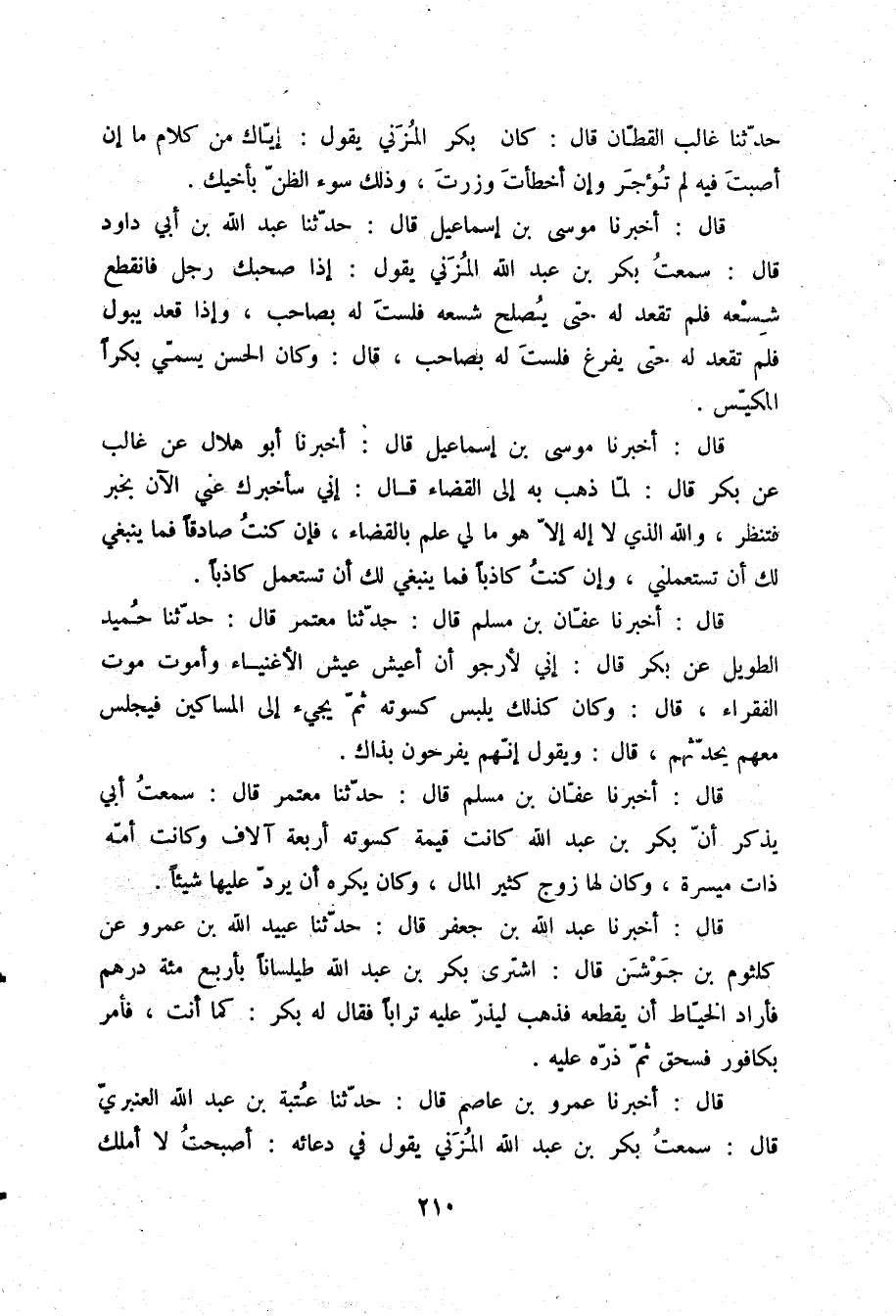 قَالَ: أَخْبَرَنَا عَفَّانُ بْنُ مُسْلِمٍ قَالَ: حَدَّثَنَا مُعْتَمِرٌ قَالَ: سَمِعْتُ أَبِي يَذْكُرُ «§أَنَّ بَكْرَ بْنَ عَبْدِ اللَّهِ كَانَتْ قِيمَةُ كِسْوَتِهِ أَرْبَعَةَ آلَافٍ، وَكَانَتْ أُمُّهُ ذَاتَ مَيْسَرَةٍ، وَكَانَ لَهَا زَوْجٌ كَثِيرُ الْمَالِ، وَكَانَ يَكْرَهُ أَنْ يَرُدَّ عَلَيْهَا شَيْئًا»