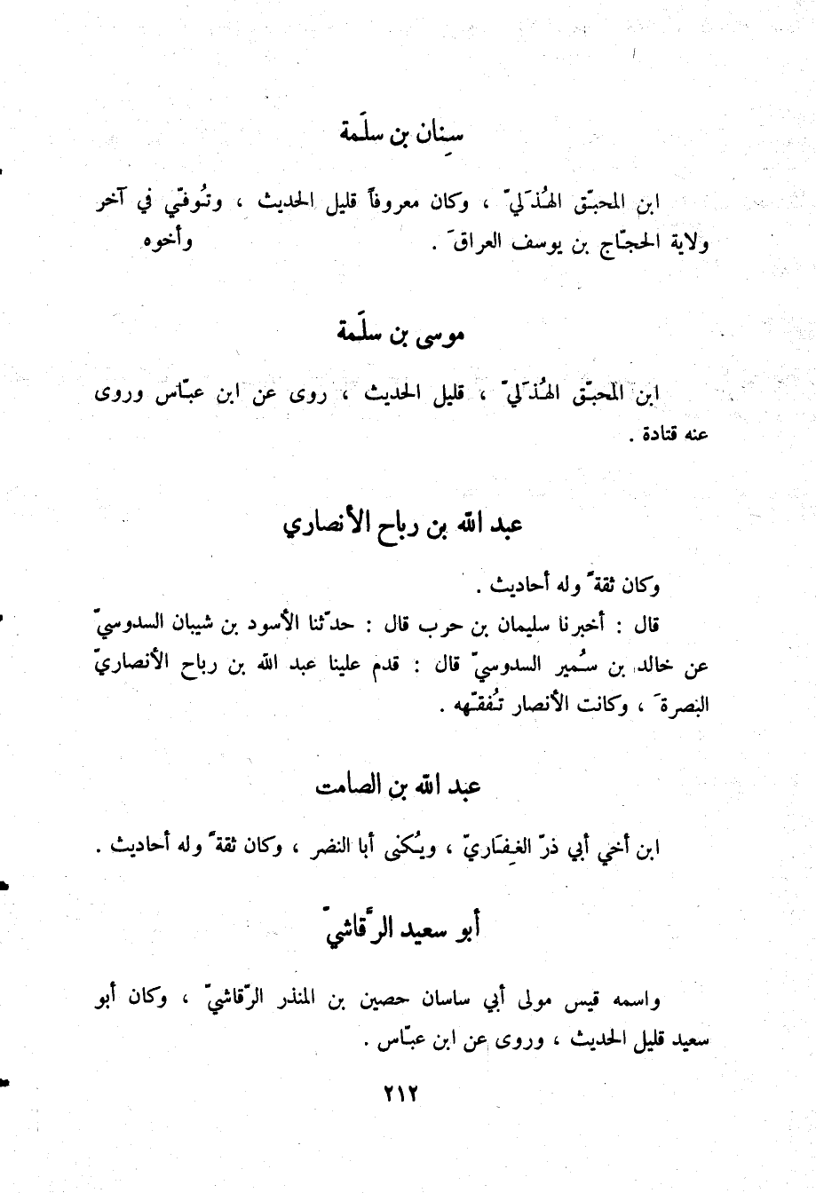 قَالَ: أَخْبَرَنَا سُلَيْمَانُ بْنُ حَرْبٍ قَالَ: حَدَّثَنَا الْأَسْوَدُ بْنُ شَيْبَانَ السَّدُوسِيُّ، عَنْ خَالِدِ بْنِ سُمَيْرِ السَّدُوسِيِّ قَالَ: «§قَدِمَ عَلَيْنَا عَبْدُ اللَّهِ بْنُ رَبَاحٍ الْأَنْصَارِيُّ الْبَصْرَةَ، وَكَانَتِ الْأَنْصَارُ تُفَقِّهُهُ»