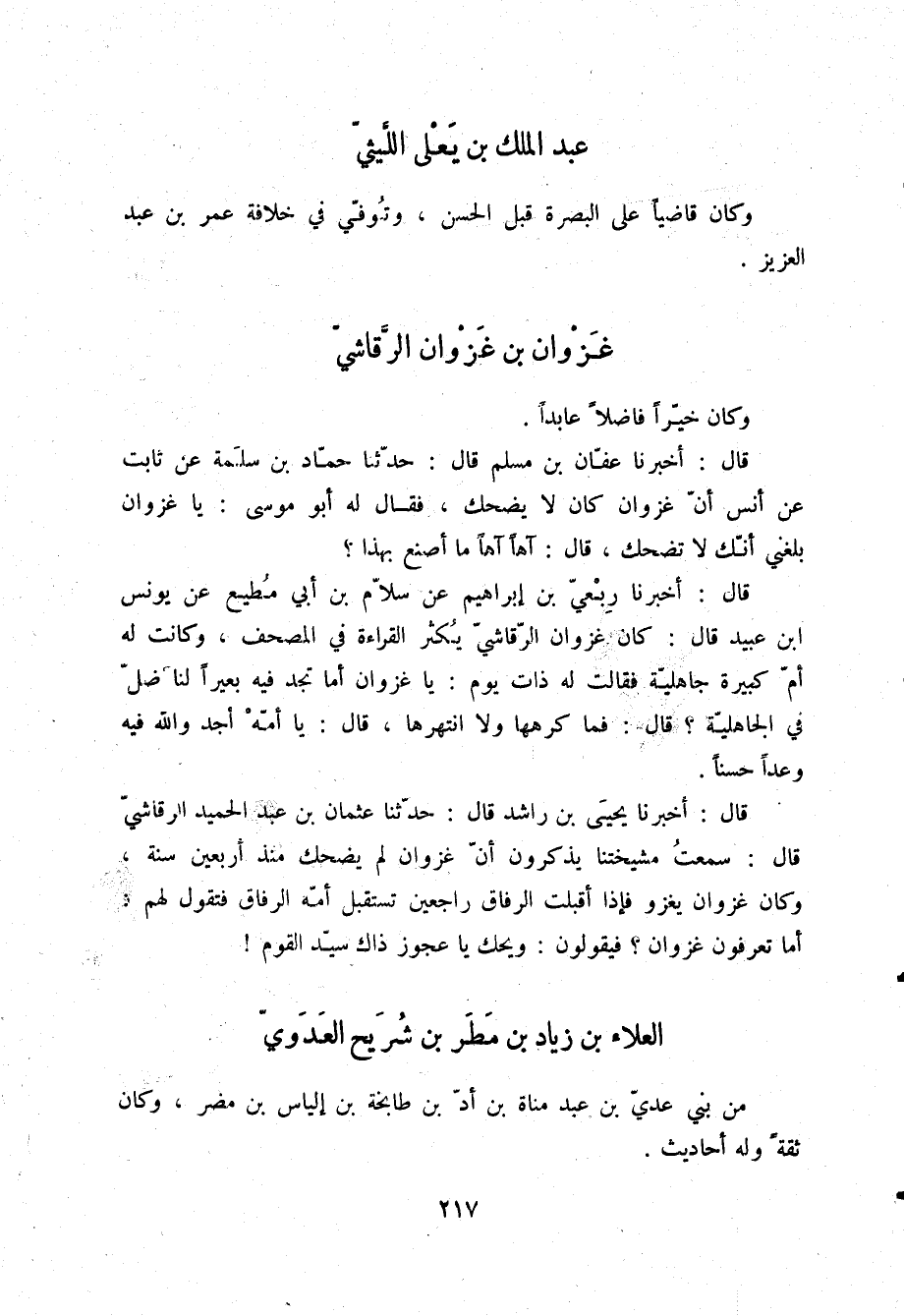 قَالَ: أَخْبَرَنَا يَحْيَى بْنُ رَاشِدٍ قَالَ: حَدَّثَنَا عُثْمَانُ بْنُ عَبْدِ الْحَمِيدِ الرَّقَاشِيُّ قَالَ: سَمِعْتُ مَشْيَخَتَنَا يَذْكُرُونَ أَنَّ غَزْوَانَ لَمْ يَضْحَكْ مُنْذُ أَرْبَعِينَ سَنَةً، وَكَانَ غَزْوَانُ يَغْزُو، فَإِذَا أَقْبَلَتِ الرِّفَاقُ رَاجِعِينَ تَسْتَقْبِلُ أُمُّهُ الرِّفَاقَ، فَتَقُولُ لَهُمْ: أَمَا تَعْرِفُونَ غَزْوَانَ؟ فَيَقُولُونَ: «§وَيْحَكِ يَا عَجُوزُ، ذَاكَ سَيِّدُ الْقَوْمِ»