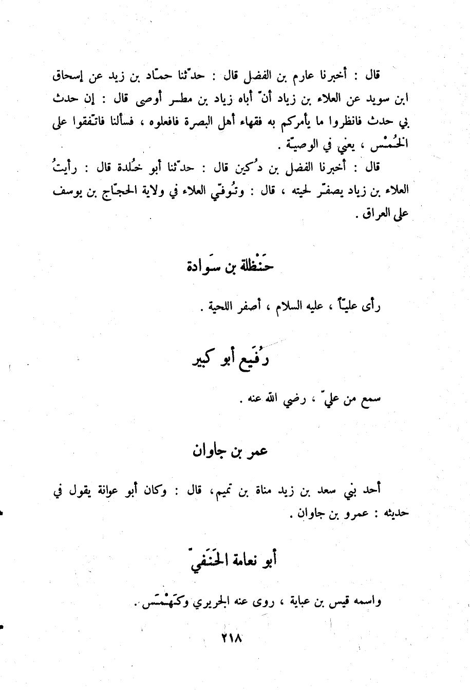 قَالَ: أَخْبَرَنَا الْفَضْلُ بْنُ دُكَيْنٍ، قَالَ: حَدَّثَنَا أَبُو خَلْدَةَ، قَالَ: «§رَأَيْتُ الْعَلَاءَ بْنَ زِيَادٍ يُصَفِّرُ لِحْيَتَهُ» قَالَ: «وَتُوُفِّيَ الْعَلَاءُ فِي وِلَايَةِ الْحَجَّاجِ بْنِ يُوسُفَ عَلَى الْعِرَاقِ»