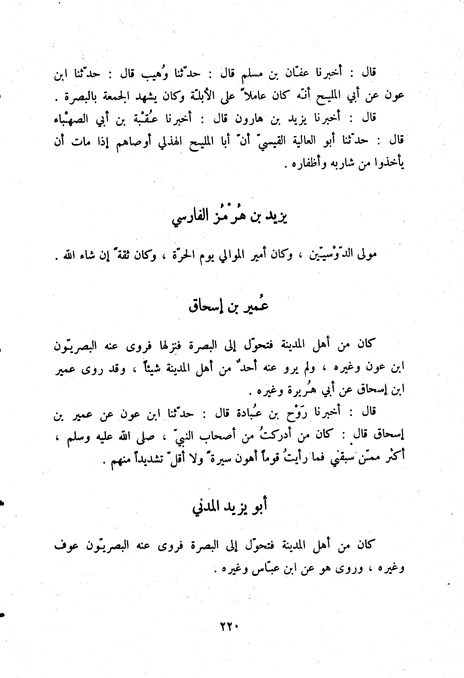 قَالَ: أَخْبَرَنَا رَوْحُ بْنُ عُبَادَةَ قَالَ: حَدَّثَنَا ابْنُ عَوْنٍ، عَنْ عُمَيْرِ بْنِ إِسْحَاقَ قَالَ: «§كَانَ مَنْ أَدْرَكْتُ مِنْ أَصْحَابِ النَّبِيِّ صلّى الله عليه وسلم أَكْثَرَ مِمَّنْ سَبَقَنِي، فَمَا رَأَيْتُ قَوْمًا أَهْوَنَ سِيرَةً، وَلَا أَقَلَّ تَشْدِيدًا مِنْهُمْ»