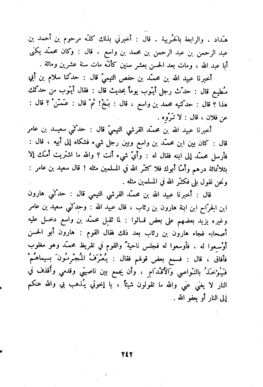 قَالَ: أَخْبَرَنَا عُبَيْدُ اللَّهِ بْنُ مُحَمَّدٍ الْقُرَشِيُّ التَّيْمِيُّ قَالَ: حَدَّثَنِي هَارُونُ بْنُ الْجَرَّاحِ ابْنِ ابْنَةِ هَارُونَ بْنِ رِئَابٍ قَالَ عُبَيْدُ اللَّهِ: وَحَدَّثَنِي سَعِيدُ بْنُ عَامِرٍ وَغَيْرُهُ، يَزِيدُ بَعْضُهُمْ عَلَى بَعْضٍ، قَالُوا: " §لَمَّا ثَقُلَ مُحَمَّدُ بْنُ وَاسِعٍ دَخَلَ عَلَيْهِ أَصْحَابُهُ، فَجَاءَ هَارُونُ بْنُ رِئَابٍ بَعْدَ ذَلِكَ، فَقَالَ الْقَوْمُ: هَارُونُ أَبُو الْحَسَنِ، أَوْسِعُوا لَهُ فَأَوْسَعُوا لَهُ، فَجَلَسَ نَاحِيَةً، وَالْقَوْمُ فِي تَقْرِيظِ مُحَمَّدٍ وَهُوَ مَغْلُوبٌ، فَأَفَاقَ قَالَ: فَسَمِعَ بَعْضَ قَوْلِهِمْ، فَقَالَ: {يُعْرَفُ الْمُجْرِمُونَ بِسِيمَاهُمْ فَيُؤْخَذُ بِالنَّوَاصِي وَالْأَقْدَامِ} [الرحمن: 41] ، وَأَنْ يُجْمَعَ بَيْنَ نَاصِيَتِي وَقَدَمَيَّ وَأُقْذَفُ فِي النَّارِ لَا يُغْنِي عَنِّي، وَاللَّهِ، مَا تَقُولُونَ شَيْئًا، يَا إِخْوَتِي، يُذْهَبُ بِي، وَاللَّهِ، عَنْكُمْ إِلَى النَّارِ، أَوْ يَعْفُو اللَّهُ "