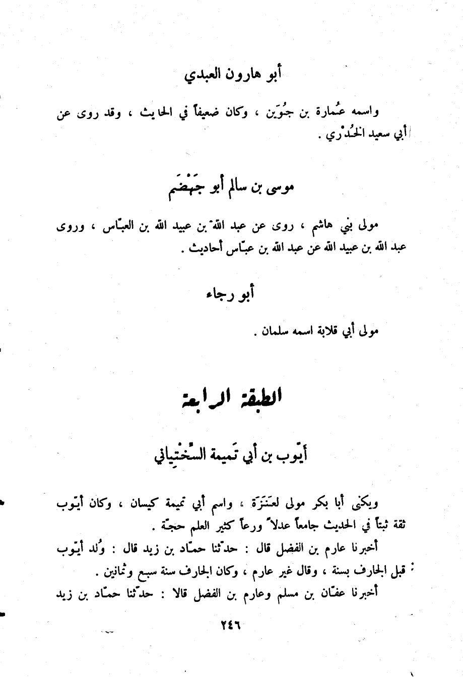 أَخْبَرَنَا عَارِمُ بْنُ الْفَضْلِ قَالَ: حَدَّثَنَا حَمَّادُ بْنُ زَيْدٍ قَالَ: «§وُلِدَ أَيُّوبُ قَبْلَ الْجَارِفِ بِسَنَةٍ» وَقَالَ غَيْرُ عَارِمٍ: وَكَانَ الْجَارِفُ سَنَةَ سَبْعٍ وَثَمَانِينَ