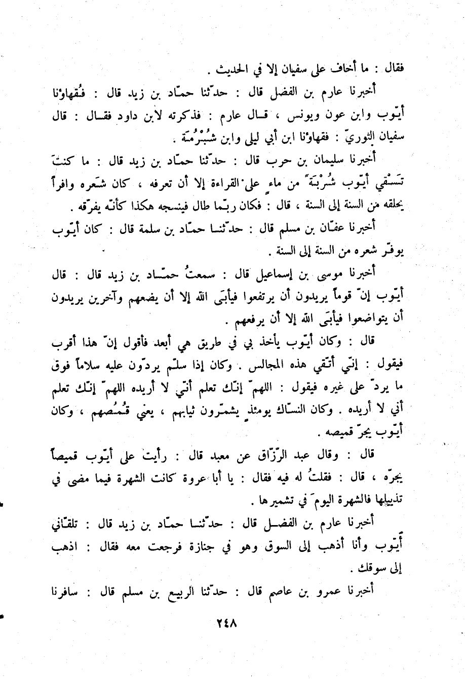 أَخْبَرَنَا سُلَيْمَانُ بْنُ حَرْبٍ قَالَ: حَدَّثَنَا حَمَّادُ بْنُ زَيْدٍ قَالَ: «§مَا كُنْتَ تَسْقِي أَيُّوبَ شَرْبَةً مِنْ مَاءٍ عَلَى الْقِرَاءَةِ إِلَّا أَنْ تَعْرِفَهُ، كَانَ شَعْرُهُ وَافِرًا، يَحْلِقُهُ مِنَ السَّنَةِ إِلَى السَّنَةِ» ، قَالَ: «فَكَانَ رُبَّمَا طَالَ، فَيَنْسِجُهُ هَكَذَا، كَأَنَّهُ يُفَرِّقُهُ»