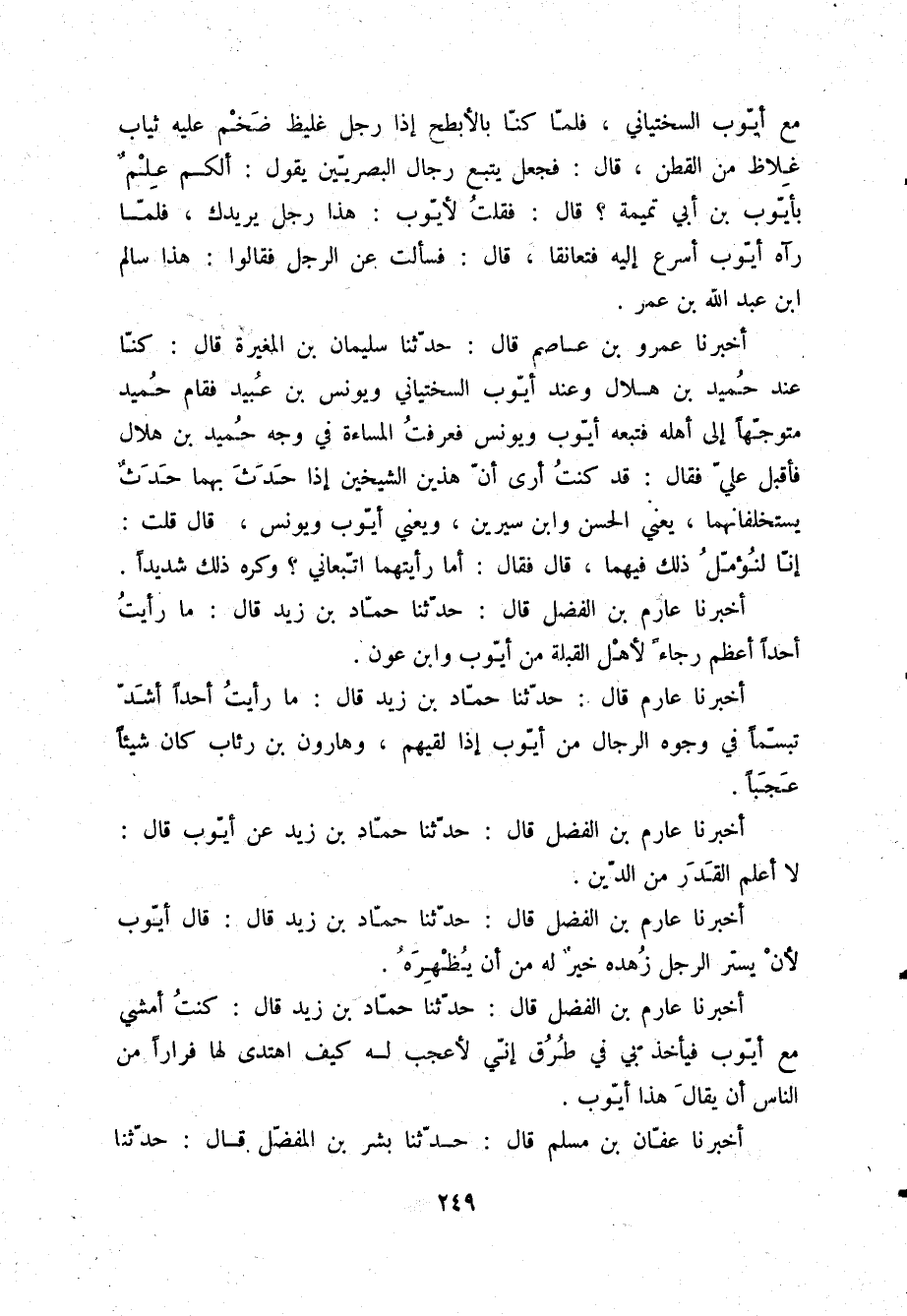 أَخْبَرَنَا عَارِمُ بْنُ الْفَضْلِ قَالَ: حَدَّثَنَا حَمَّادُ بْنُ زَيْدٍ قَالَ: «§كُنْتُ أَمْشِي مَعَ أَيُّوبَ، فَيَأْخُذُ بِي فِي طُرُقٍ إِنِّي لَأَعْجَبُ لَهُ كَيْفَ اهْتَدَى لَهَا؛ فِرَارًا مِنَ النَّاسِ أَنْ يُقَالَ هَذَا أَيُّوبُ»