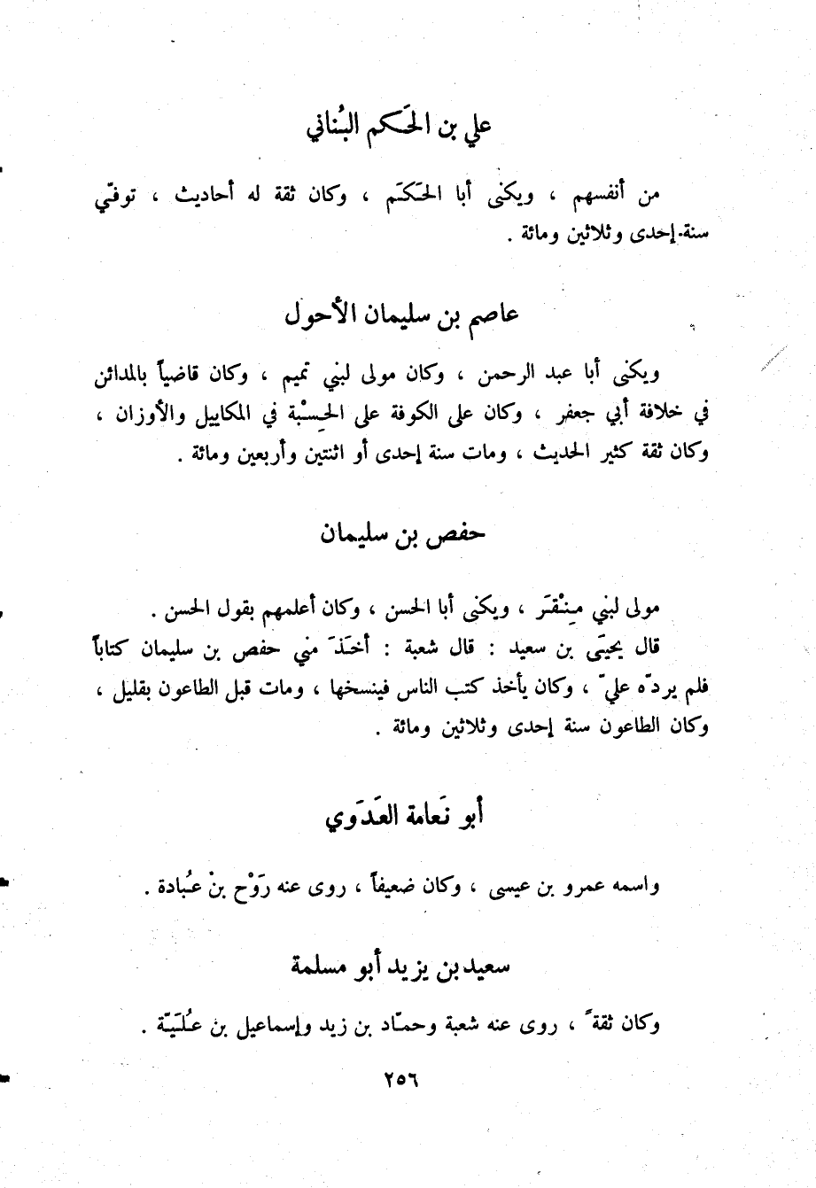 §عَاصِمُ بْنُ سُلَيْمَانَ الْأَحْوَلُ وَيُكْنَى أَبَا عَبْدِ الرَّحْمَنِ، وَكَانَ مَوْلًى لِبَنِي تَمِيمٍ، وَكَانَ قَاضِيًا بِالْمَدَائِنِ فِي خِلَافَةِ أَبِي جَعْفَرٍ، وَكَانَ عَلَى الْكُوفَةِ عَلَى الْحِسْبَةِ فِي الْمَكَايِيلِ وَالْأَوْزَانِ، وَكَانَ ثِقَةً، كَثِيرَ الْحَدِيثِ، وَمَاتَ سَنَةَ إِحْدَى أَوِ اثْنَتَيْنِ وَأَرْبَعِينَ وَمِائَةٍ