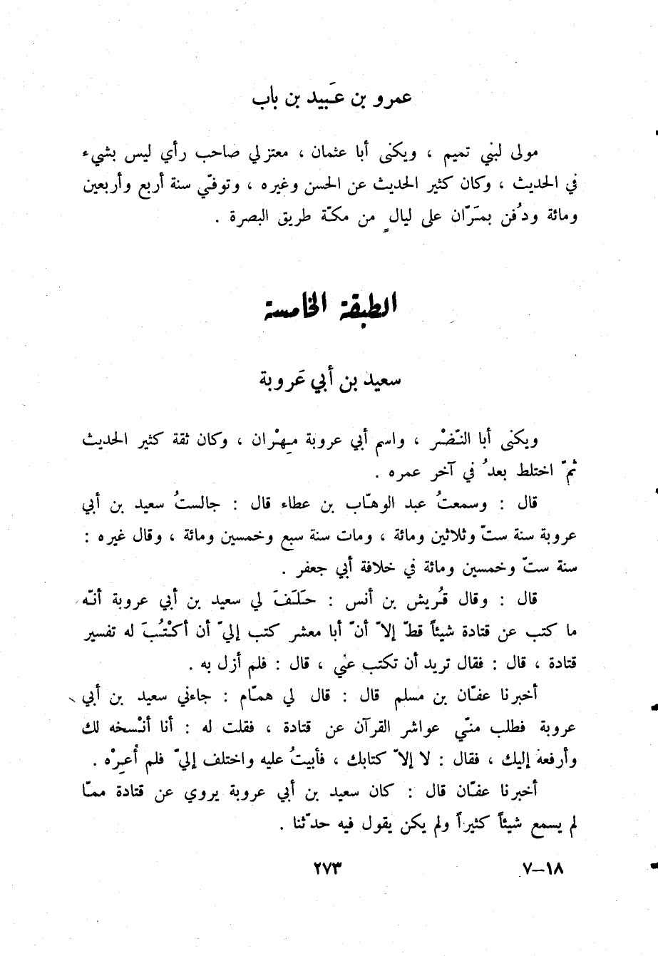 قَالَ: وَسَمِعْتُ عَبْدَ الْوَهَّابِ بْنَ عَطَاءٍ قَالَ: «§جَالَسْتُ سَعِيدَ بْنَ أَبِي عَرُوبَةَ سَنَةَ سِتٍّ وَثَلَاثِينَ وَمِائَةٍ، وَمَاتَ سَنَةَ سَبْعٍ وَخَمْسِينَ وَمِائَةٍ» وَقَالَ غَيْرُهُ: «سَنَةَ سِتٍّ وَخَمْسِينَ وَمِائَةٍ فِي خِلَافَةِ أَبِي جَعْفَرٍ»