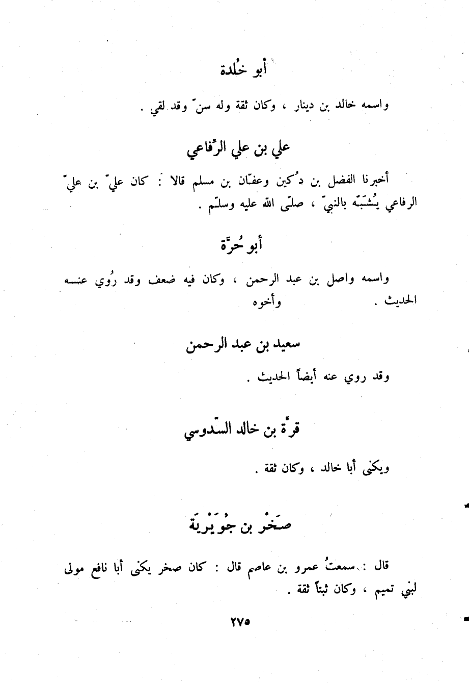 أَخْبَرَنَا الْفَضْلُ بْنُ دُكَيْنٍ، وَعَفَّانُ بْنُ مُسْلِمٍ، قَالَا: «§كَانَ عَلِيُّ بْنُ عَلِيٍّ الرِّفَاعِيُّ يُشَبَّهُ بِالنَّبِيِّ صلّى الله عليه وسلم»