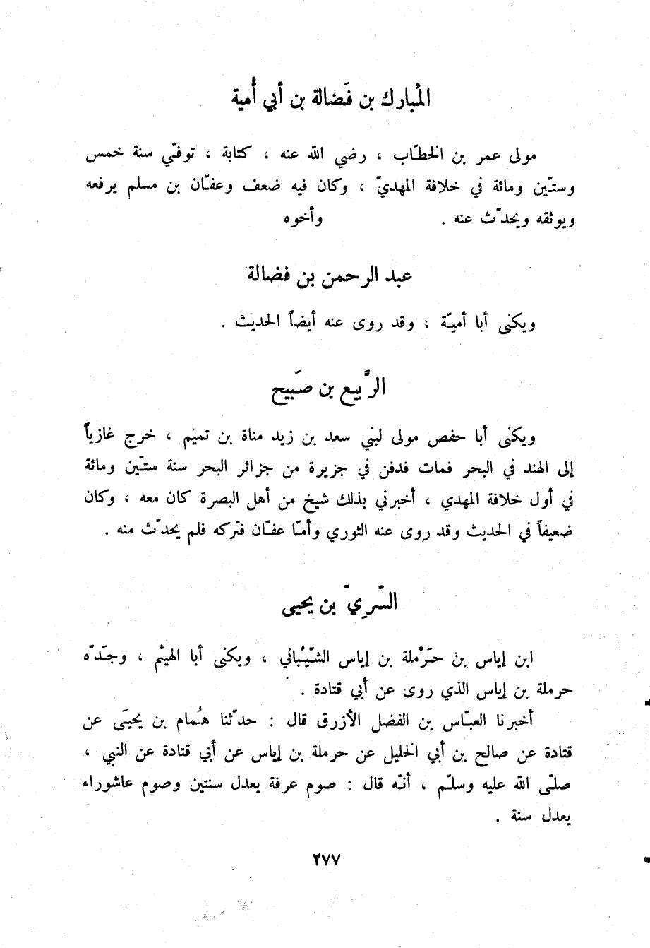 §الْمُبَارَكُ بْنُ فَضَالَةَ بْنِ أَبِي أُمَيَّةَ مَوْلَى عُمَرَ بْنِ الْخَطَّابِ رَضِيَ اللَّهُ عَنْهُ كِتَابَةً، تُوُفِّيَ سَنَةَ خَمْسٍ وَسِتِّينَ وَمِائَةٍ فِي خِلَافَةِ الْمَهْدِيِّ، وَكَانَ فِيهِ ضَعْفٌ، وَعَفَّانُ بْنُ مُسْلِمٍ يَرْفَعُهُ وَيُوَثِّقُهُ وَيُحَدِّثُ عَنْهُ
