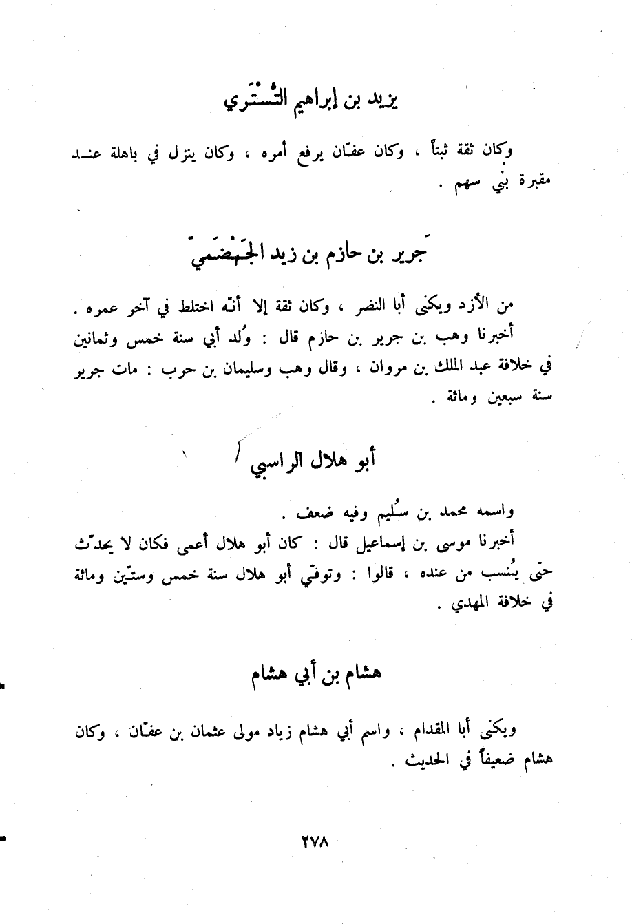 §جَرِيرُ بْنُ حَازِمِ بْنِ زَيْدٍ الْجَهْضَمِيُّ مِنَ الْأَزْدِ، وَيُكْنَى أَبَا النَّضْرِ، وَكَانَ ثِقَةً، إِلَّا أَنَّهُ اخْتَلَطَ فِي آخِرِ عُمْرِهِ