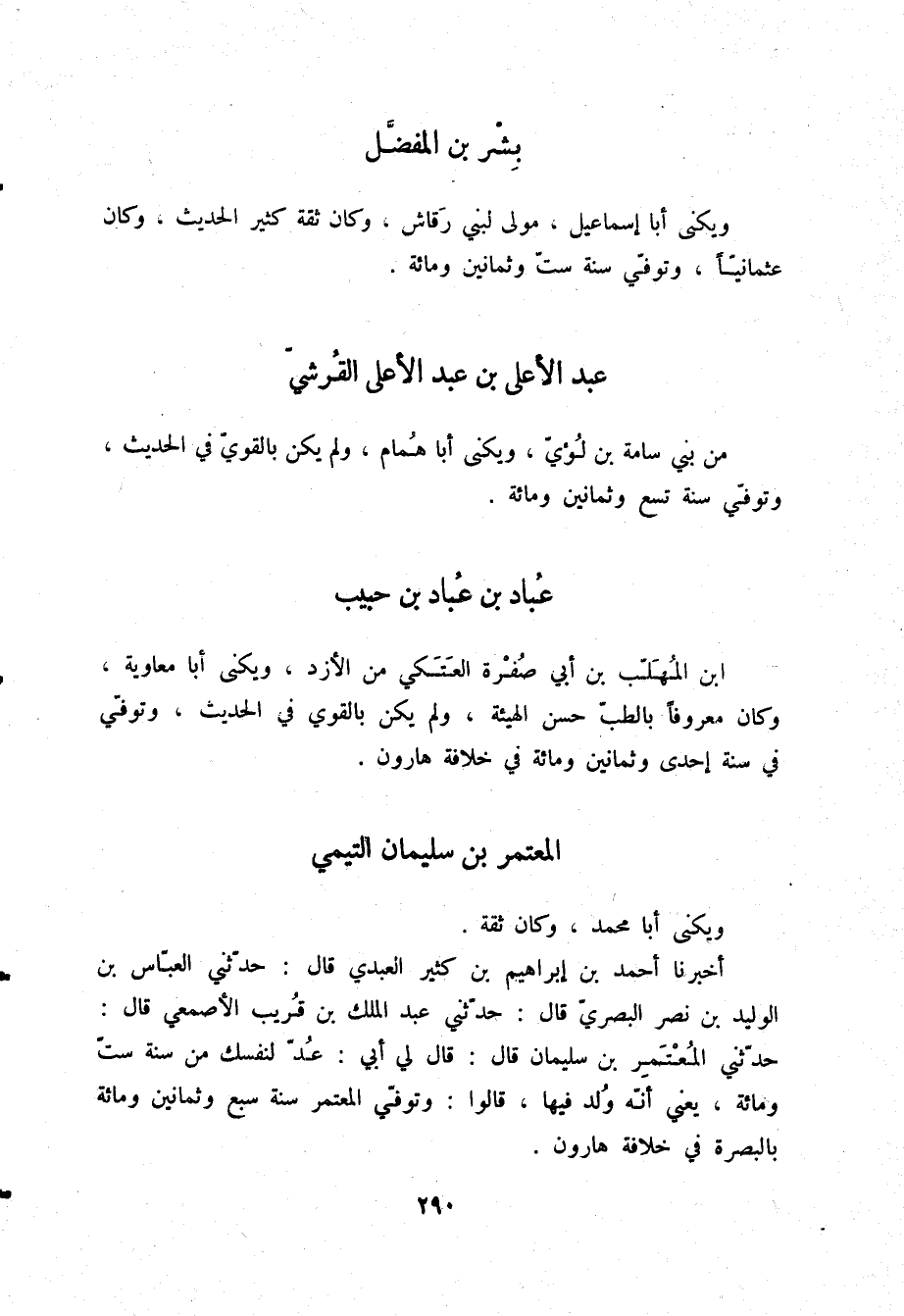 أَخْبَرَنَا أَحْمَدُ بْنُ إِبْرَاهِيمَ بْنِ كَثِيرٍ الْعَبْدِيُّ، قَالَ: حَدَّثَنِي الْعَبَّاسُ بْنُ الْوَلِيدِ بْنِ نَصْرٍ الْبَصْرِيُّ، قَالَ: حَدَّثَنِي عَبْدُ الْمَلِكِ بْنُ قَرِيبٍ الْأَصْمَعِيُّ، قَالَ: حَدَّثَنِي الْمُعْتَمِرُ بْنُ سُلَيْمَانَ، قَالَ: قَالَ لِي أَبِي: «§عُدَّ لِنَفْسِكَ مِنْ سَنَةِ سِتٍّ وَمِائَةٍ - يَعْنِي أَنَّهُ وُلِدَ فِيهَا -» قَالُوا: «وَتُوُفِّيَ الْمُعْتَمِرُ سَنَةَ سَبْعٍ وَثَمَانِينَ وَمِائَةٍ بِالْبَصْرَةِ فِي خِلَافَةِ هَارُونَ»