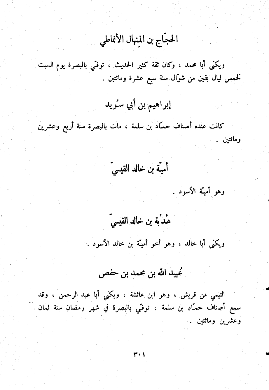 §الْحَجَّاجُ بْنُ الْمِنْهَالِ الْأَنْمَاطِيُّ وَيُكْنَى أَبَا مُحَمَّدٍ، وَكَانَ ثِقَةً كَثِيرَ الْحَدِيثِ، تُوُفِّيَ بِالْبَصْرَةِ يَوْمَ السَّبْتِ لِخَمْسِ لَيَالٍ بَقِينَ مِنْ شَوَّالٍ سَنَةَ سَبْعَ عَشْرَةَ وَمِائَتَيْنِ
