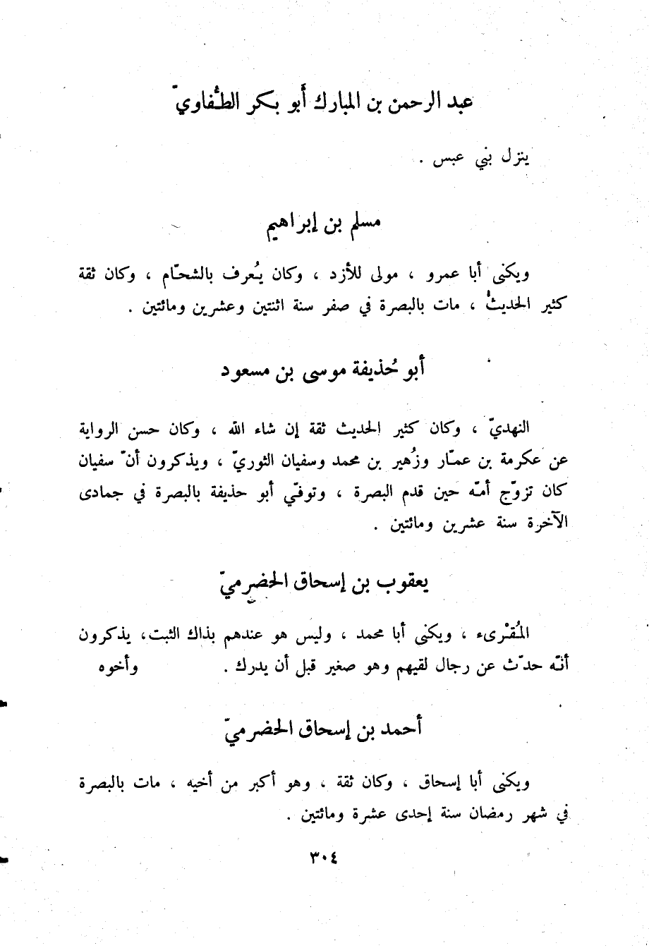 §أَبُو حُذَيْفَةَ مُوسَى بْنُ مَسْعُودٍ النَّهْدِيُّ وَكَانَ كَثِيرَ الْحَدِيثِ، ثِقَةً إِنْ شَاءَ اللَّهُ، وَكَانَ حَسَنَ الرِّوَايَةِ عَنْ عِكْرِمَةَ بْنِ عَمَّارٍ، وَزُهَيْرِ بْنِ مُحَمَّدٍ، وَسُفْيَانَ الثَّوْرِيِّ، وَيَذْكُرُونَ أَنَّ سُفْيَانَ كَانَ تَزَوَّجَ أُمَّهُ حِينَ قَدِمَ الْبَصْرَةَ، وَتُوُفِّيَ أَبُو حُذَيْفَةَ بِالْبَصْرَةِ فِي جُمَادَى الْآخِرَةِ سَنَةَ عِشْرِينَ وَمِائَتَيْنِ