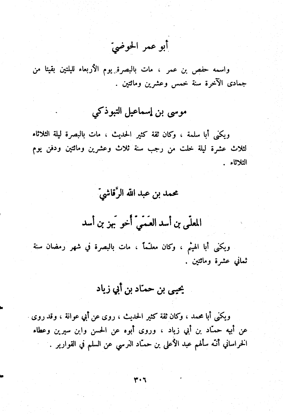 §أَبُو عُمَرَ الْحَوْضِيُّ وَاسْمُهُ حَفْصُ بْنُ عُمَرَ، مَاتَ بِالْبَصْرَةِ يَوْمَ الْأَرْبِعَاءِ لِلَيْلَتَيْنِ بَقِيَتَا مِنْ جُمَادَى الْآخِرَةِ سَنَةَ خَمْسٍ وَعِشْرِينَ وَمِائَتَيْنِ
