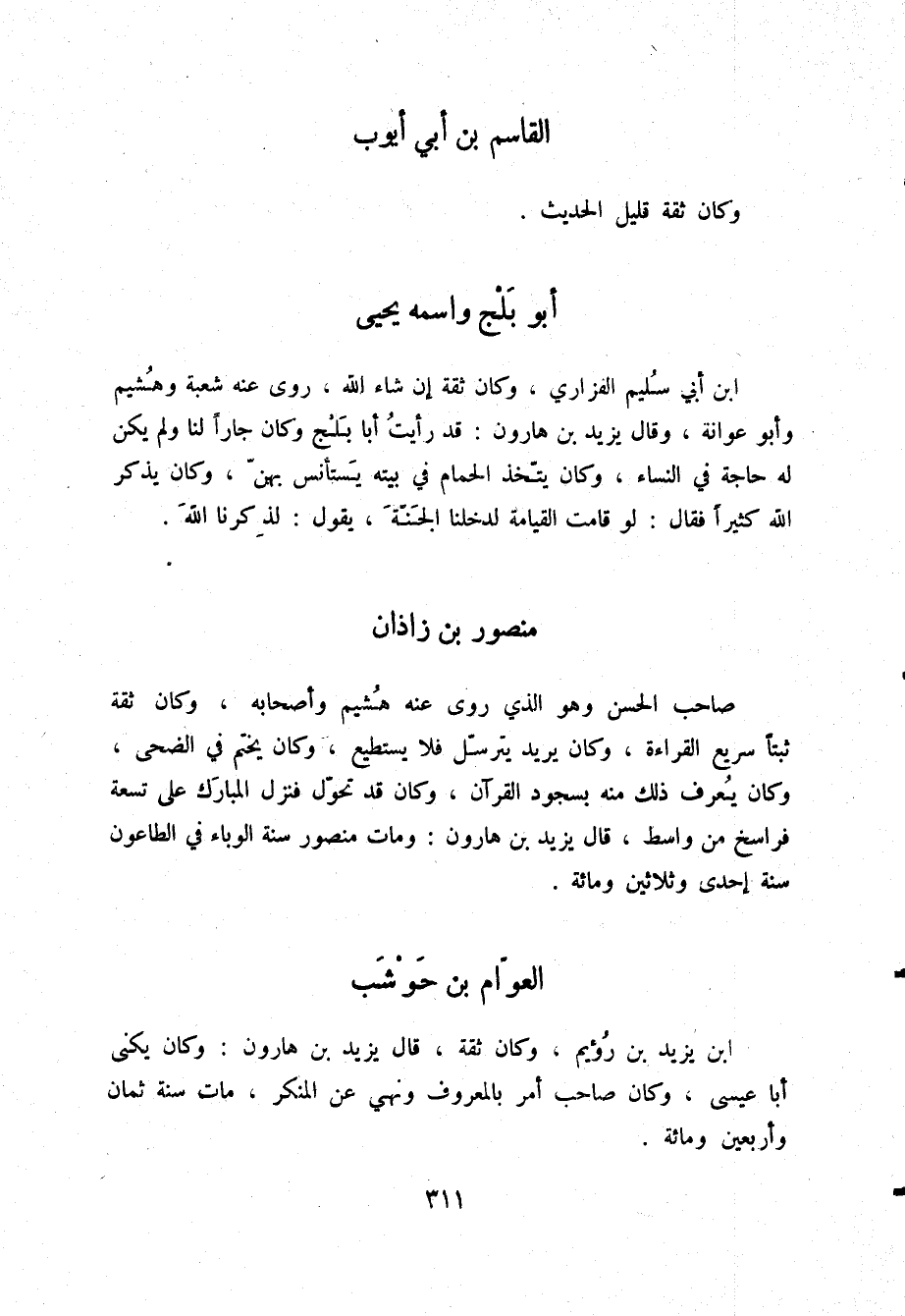 §مَنْصُورُ بْنُ زَاذَانَ صَاحِبُ الْحَسَنِ، وَهُوَ الَّذِي رَوَى عَنْهُ هُشَيْمٌ وَأَصْحَابُهُ، وَكَانَ ثِقَةً، ثَبْتًا، سَرِيعَ الْقِرَاءَةِ، وَكَانَ يُرِيدُ يَتَرَسَّلُ فَلَا يَسْتَطِيعُ، وَكَانَ يَخْتِمُ فِي الضُّحَى، وَكَانَ يُعْرَفُ ذَلِكَ مِنْهُ بِسُجُودِ الْقُرْآنِ، وَكَانَ قَدْ تَحَوَّلَ، فَنَزَلَ الْمُبَارَكَ عَلَى تِسْعَةِ فَرَاسِخَ مِنْ وَاسِطَ قَالَ يَزِيدُ بْنُ هَارُونَ: وَمَاتَ مَنْصُورٌ سَنَةَ الْوَبَاءِ فِي الطَّاعُونِ سَنَةَ إِحْدَى وَثَلَاثِينَ وَمِائَةٍ