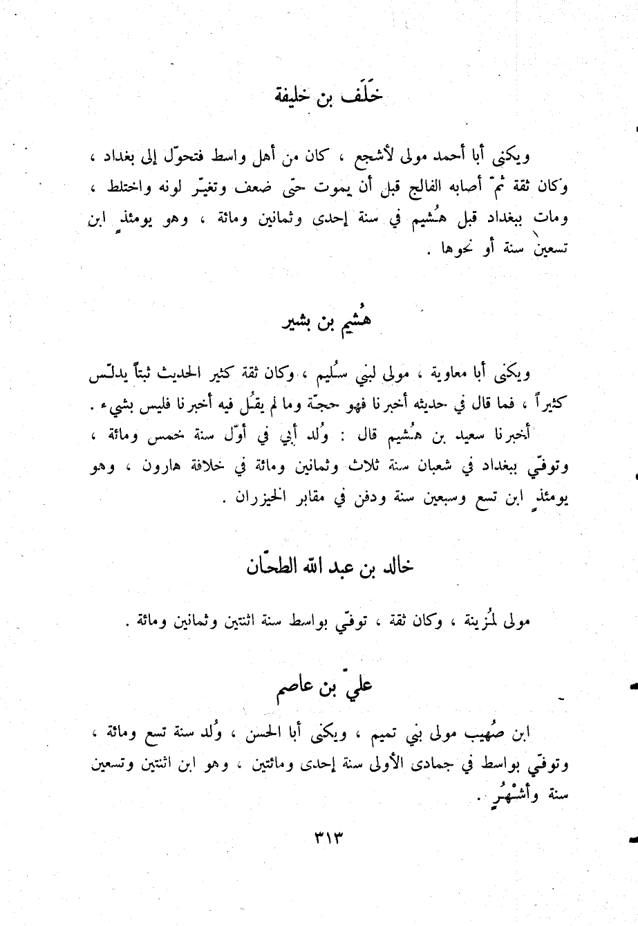 §هُشَيْمُ بْنُ بَشِيرٍ وَيُكْنَى أَبَا مُعَاوِيَةَ، مَوْلًى لِبَنِي سُلَيْمٍ، وَكَانَ ثِقَةً، كَثِيرَ الْحَدِيثِ، ثَبْتًا، يُدَلِّسُ كَثِيرًا، فَمَا قَالَ فِي حَدِيثِهِ أَخْبَرَنَا فَهُوَ حُجَّةٌ، وَمَا لَمْ يَقُلْ فِيهِ أَخْبَرَنَا فَلَيْسَ بِشَيْءٍ