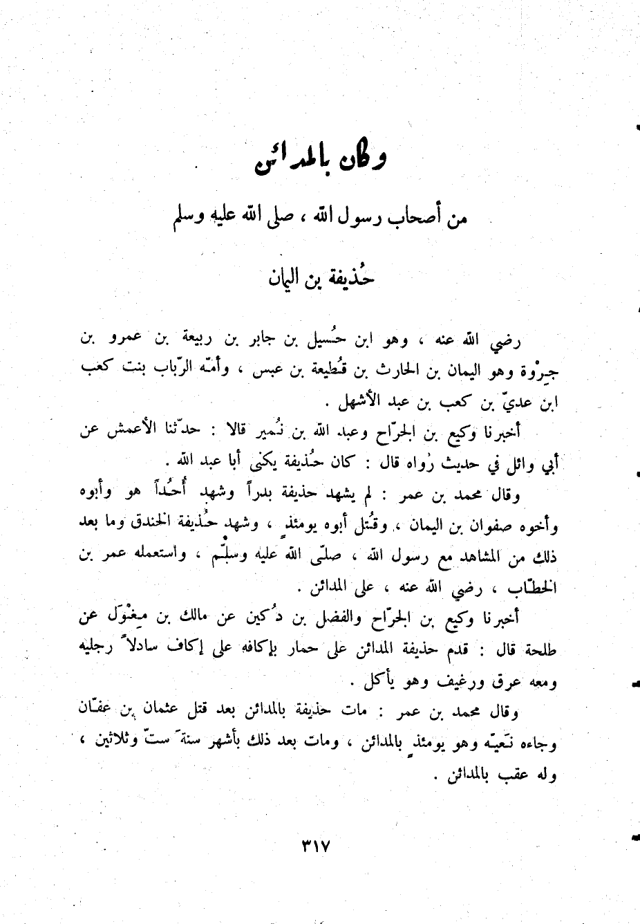 أَخْبَرَنَا وَكِيعُ بْنُ الْجَرَّاحِ، وَالْفَضْلُ بْنُ دُكَيْنٍ، عَنْ مَالِكِ بْنِ مِغْوَلٍ، عَنْ طَلْحَةَ قَالَ: «§قَدِمَ حُذَيْفَةُ الْمَدَائِنَ عَلَى حِمَارٍ بِإِكَافِهِ عَلَى إِكَافٍ، سَادِلًا رِجْلَيْهِ، وَمَعَهُ عِرْقٌ وَرَغْيفٌ وَهُوَ يَأْكُلُ» وَقَالَ مُحَمَّدُ بْنُ عُمَرَ: مَاتَ حُذَيْفَةُ بِالْمَدَائِنِ بَعْدَ قَتْلِ عُثْمَانَ بْنِ عَفَّانَ، وَجَاءَهُ نَعْيُهُ وَهُوَ يَوْمَئِذٍ بِالْمَدَائِنِ، وَمَاتَ بَعْدَ ذَلِكَ بِأَشْهُرٍ سَنَةَ سِتٍّ وَثَلَاثِينَ، وَلَهُ عَقِبٌ بِالْمَدَائِنِ