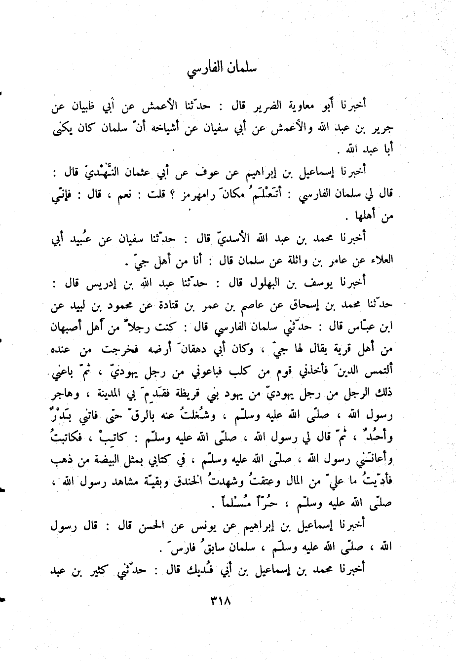أَخْبَرَنَا أَبُو مُعَاوِيَةَ الضَّرِيرُ، قَالَ: حَدَّثَنَا الْأَعْمَشُ، عَنْ أَبِي ظَبْيَانَ، عَنْ جَرِيرِ بْنِ عَبْدِ اللَّهِ. وَالْأَعْمَشِ، عَنْ أَبِي سُفْيَانَ، عَنْ أَشْيَاخِهِ: «§أَنَّ سَلْمَانَ كَانَ يُكْنَى أَبَا عَبْدِ اللَّهِ»