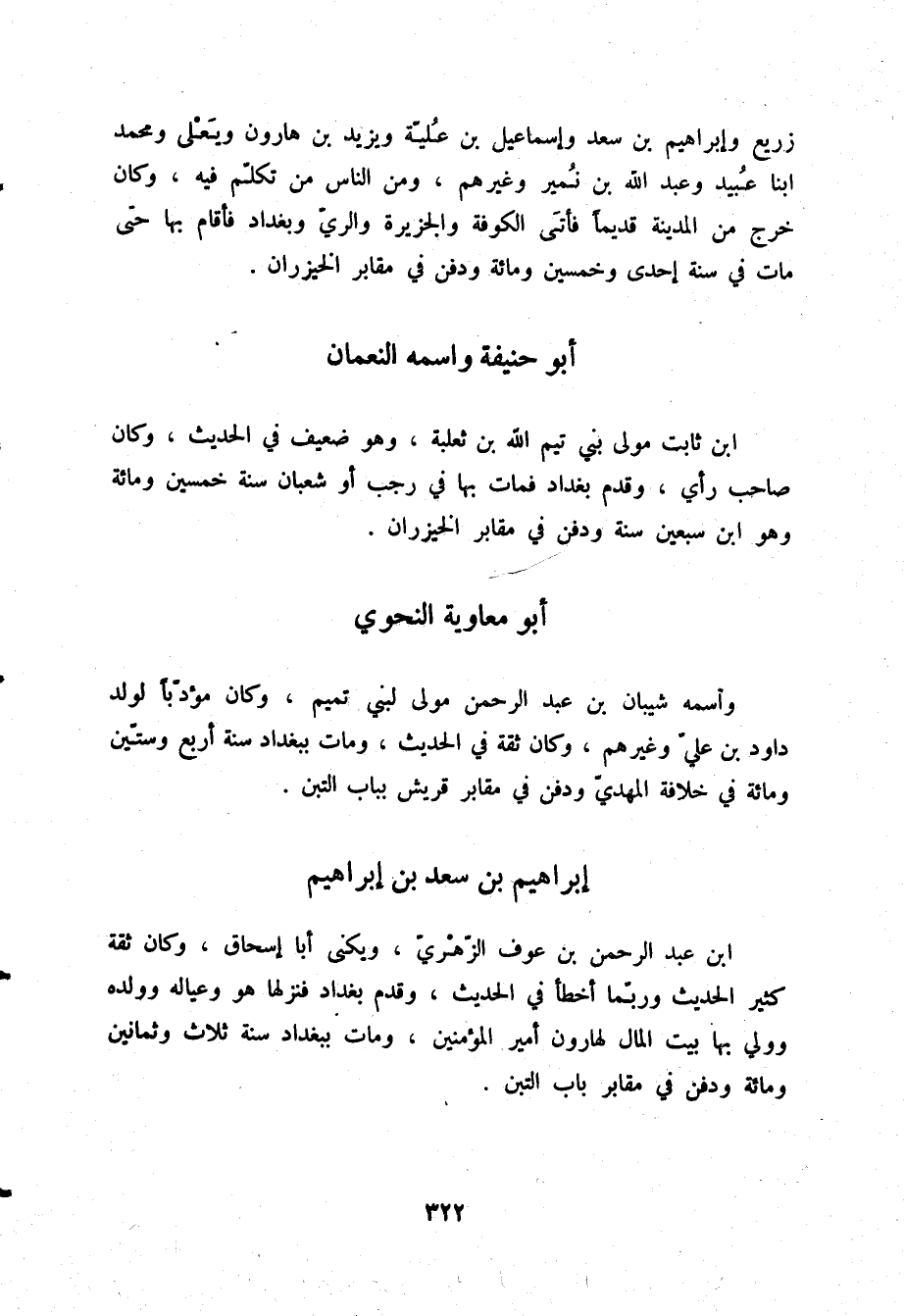 §أَبُو حَنِيفَةَ وَاسْمُهُ النُّعْمَانُ بْنُ ثَابِتٍ، مَوْلَى بَنِي تَيْمِ اللَّهِ بْنِ ثَعْلَبَةَ، وَهُوَ ضَعِيفٌ فِي الْحَدِيثِ، وَكَانَ صَاحِبَ رَأْيٍ، وَقَدِمَ بَغْدَادَ، فَمَاتَ بِهَا فِي رَجَبٍ أَوْ شَعْبَانَ سَنَةَ خَمْسِينَ وَمِائَةٍ، وَهُوَ ابْنُ سَبْعِينَ سَنَةً، وَدُفِنَ فِي مَقَابِرِ الْخَيْزُرَانِ