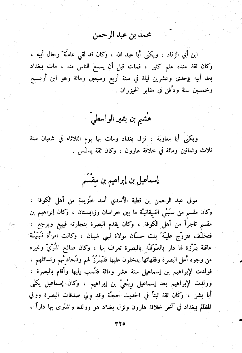 §هُشَيْمُ بْنُ بَشِيرٍ الْوَاسِطِيُّ وَيُكْنَى أَبَا مُعَاوِيَةَ، نَزَلَ بَغْدَادَ، وَمَاتَ بِهَا يَوْمَ الثُّلَاثَاءِ فِي شَعْبَانَ سَنَةَ ثَلَاثٍ وَثَمَانِينَ وَمِائَةٍ فِي خِلَافَةِ هَارُونَ، وَكَانَ ثِقَةً يُدَلِّسُ