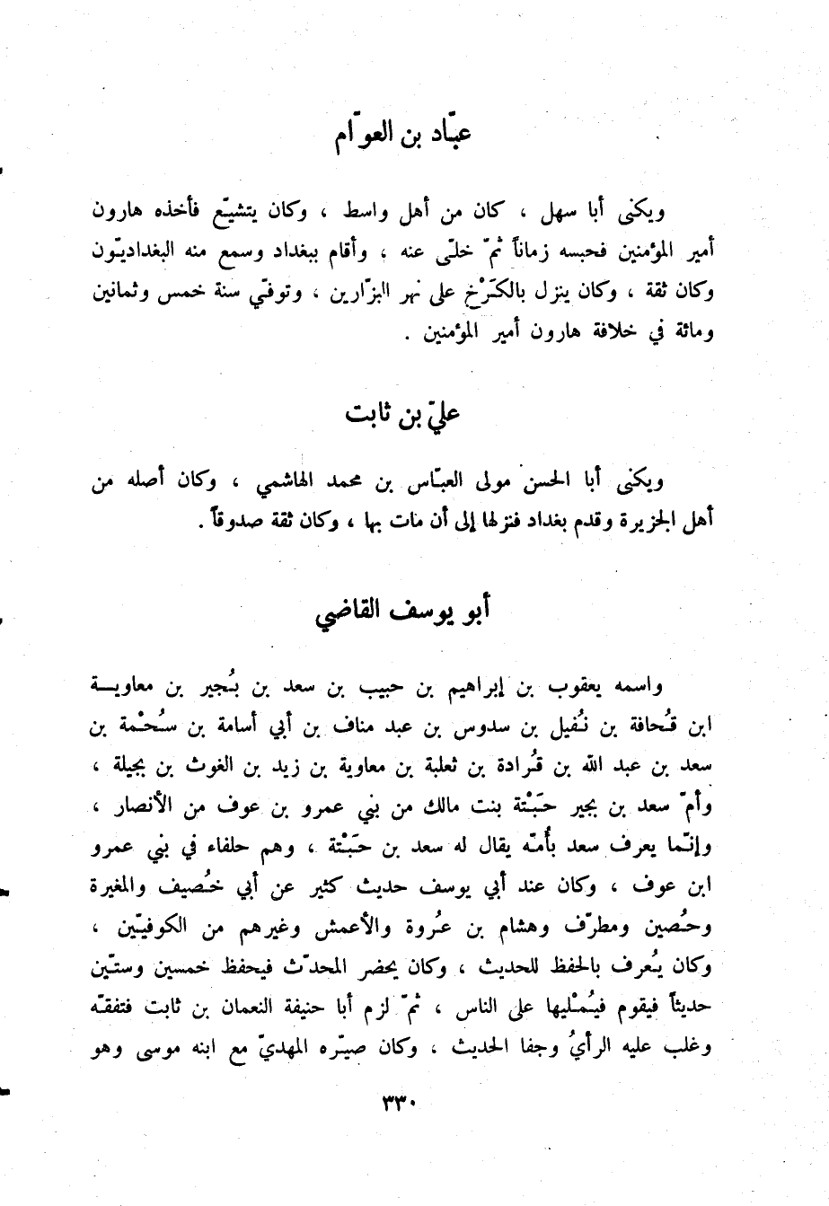 §أَبُو يُوسُفَ الْقَاضِي وَاسْمُهُ: يَعْقُوبُ بْنُ إِبْرَاهِيمَ بْنِ حَبِيبِ بْنِ سَعْدِ بْنِ بُجَيْرِ بْنِ مُعَاوِيَةَ بْنِ قُحَافَةَ بْنِ نُفَيْلِ بْنِ سَدُوسِ بْنِ عَبْدِ مَنَافِ بْنِ أَبِي أُسَامَةَ بْنِ سُحْمَةَ بْنِ سَعْدِ بْنِ عَبْدِ اللَّهِ بْنِ قُرَادَةَ بْنِ ثَعْلَبَةَ بْنِ مُعَاوِيَةَ بْنِ زَيْدِ بْنِ الْغَوْثِ بْنِ بَجِيلَةَ، وَأُمُّ سَعْدِ بْنِ بُجَيْرٍ حَبْتَةُ بِنْتُ مَالِكٍ مِنْ بَنِي عَمْرِو بْنِ عَوْفٍ مِنَ الْأَنْصَارِ، وَإِنَّمَا يُعْرَفُ سَعْدٌ بِأُمِّهِ، يُقَالُ لَهُ سَعْدُ بْنُ حَبْتَةَ، وَهُمْ حُلَفَاءُ فِي بَنِي عَمْرِو بْنِ عَوْفٍ، وَكَانَ عِنْدَ أَبِي يُوسُفَ حَدِيثٌ كَثِيرٌ عَنْ أَبِي خُصَيْفٍ، وَالْمُغِيرَةِ، وَحُصَيْنٍ، وَمُطَرِّفٍ، وَهِشَامِ بْنِ عُرْوَةَ، وَالْأَعْمَشِ، وَغَيْرِهِمْ مِنَ الْكُوفِيِّينَ، وَكَانَ يُعْرَفُ بِالْحِفْظِ لِلْحَدِيثِ، وَكَانَ يَحْضُرُ الْمُحَدِّثَ فَيَحْفَظُ خَمْسِينَ وَسِتِّينَ حَدِيثًا، فَيَقُومُ فَيُمْلِيهَا عَلَى النَّاسِ، ثُمَّ لَزِمَ أَبَا حَنِيفَةَ النُّعْمَانَ بْنَ ثَابِتٍ فَتَفَقَّهَ وَغَلَبَ عَلَيْهِ الرَّأْيُ وَجَفَا الْحَدِيثَ، وَكَانَ صَيَّرَهُ الْمَهْدِيُّ مَعَ ابْنِهِ مُوسَى وَهُوَ