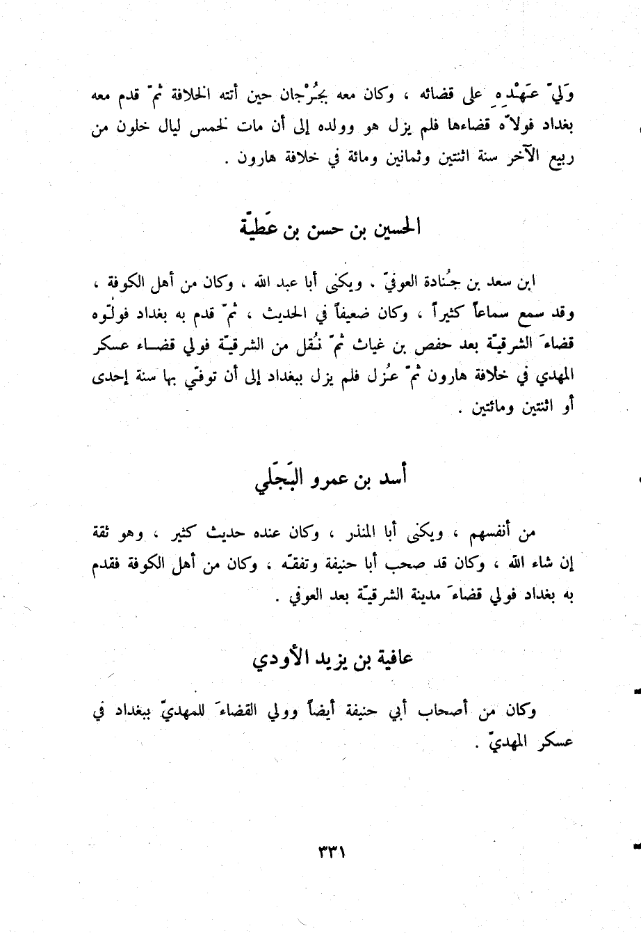 §عَافِيَةُ بْنُ يَزِيدَ الْأَوْدِيُّ وَكَانَ مِنْ أَصْحَابِ أَبِي حَنِيفَةَ أَيْضًا، وَوَلِيَ الْقَضَاءَ لِلْمَهْدِيِّ بِبَغْدَادَ فِي عَسْكَرِ الْمَهْدِيِّ