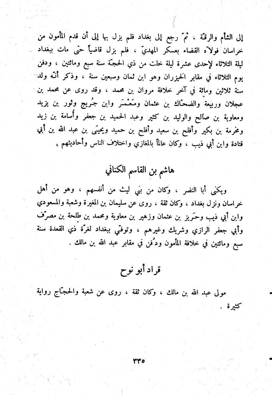 §هَاشِمُ بْنُ الْقَاسِمِ الْكِنَانِيُّ وَيُكْنَى أَبَا النَّضْرِ، وَكَانَ مِنْ بَنِي لَيْثٍ مِنْ أَنْفُسِهِمْ، وَهُوَ مِنْ أَهْلِ خُرَاسَانَ، وَنَزَلَ بَغْدَادَ، وَكَانَ ثِقَةً، رَوَى عَنْ سُلَيْمَانَ بْنِ الْمُغِيرَةِ، وَشُعْبَةَ، وَالْمَسْعُودِيِّ، وَابْنِ أَبِي ذِئْبٍ، وَحَرِيزِ بْنِ عُثْمَانَ، وَزُهَيْرِ بْنِ مُعَاوِيَةَ، وَمُحَمَّدِ بْنِ طَلْحَةَ بْنِ مُصَرِّفٍ، وَأَبِي جَعْفَرٍ الرَّازِيِّ، وَشَرِيكٍ، وَغَيْرِهِمْ، وَتُوُفِّيَ بِبَغْدَادَ لِغُرَّةِ ذِي الْقَعْدَةِ سَنَةَ سَبْعٍ وَمِائَتَيْنِ فِي خِلَافَةِ الْمَأْمُونِ، وَدُفِنَ فِي مَقَابِرِ عَبْدِ اللَّهِ بْنِ مَالِكٍ