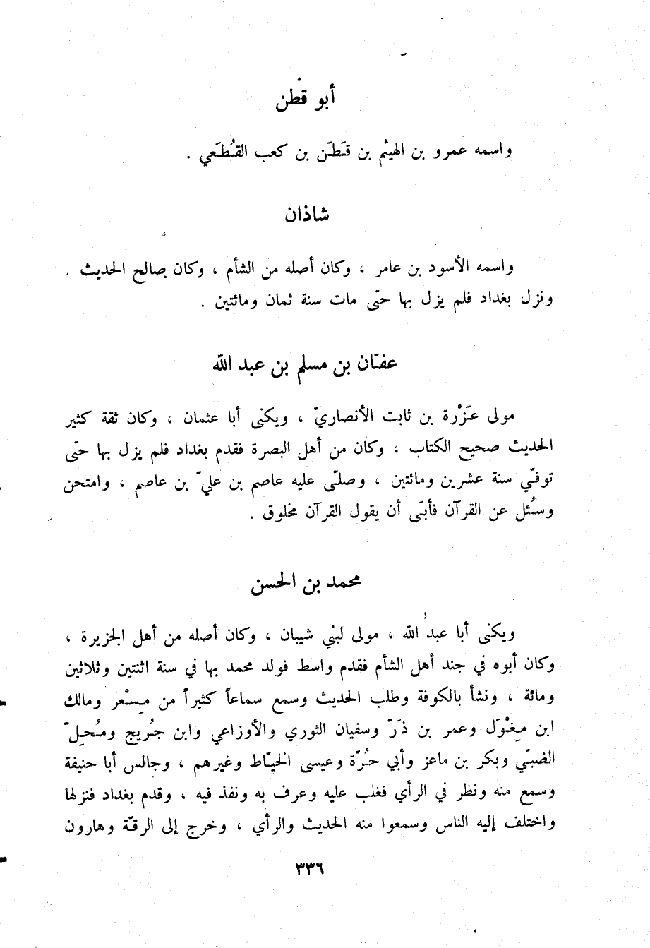 §عَفَّانُ بْنُ مُسْلِمِ بْنِ عَبْدِ اللَّهِ مَوْلَى عَزْرَةَ بْنِ ثَابِتٍ الْأَنْصَارِيِّ، وَيُكْنَى أَبَا عُثْمَانَ، وَكَانَ ثِقَةً كَثِيرَ الْحَدِيثِ، صَحِيحَ الْكِتَابِ، وَكَانَ مِنْ أَهْلِ الْبَصْرَةِ فَقَدِمَ بَغْدَادَ فَلَمْ يَزَلْ بِهَا حَتَّى تُوُفِّيَ سَنَةَ عِشْرِينَ وَمِائَتَيْنِ، وَصَلَّى عَلَيْهِ عَاصِمُ بْنُ عَلِيِّ بْنِ عَاصِمٍ، وَامْتُحِنَ وَسُئِلَ عَنِ الْقُرْآنِ، فَأَبَى أَنْ يَقُولَ: الْقُرْآنُ مَخْلُوقٌ