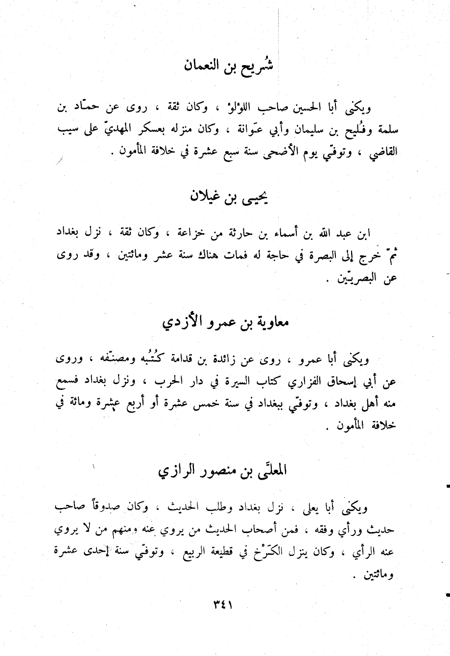 §مُعَاوِيَةُ بْنُ عَمْرٍو الْأَزْدِيُّ وَيُكْنَى أَبَا عَمْرٍو، رَوَى عَنْ زَائِدَةَ بْنِ قُدَامَةَ كُتُبَهُ وَمُصَنَّفَهُ، وَرَوَى عَنْ أَبِي إِسْحَاقَ الْفَزَارِيِّ كِتَابَ السِّيرَةِ فِي دَارِ الْحَرْبِ، وَنَزَلَ بَغْدَادَ فَسَمِعَ مِنْهُ أَهْلُ بَغْدَادَ، وَتُوُفِّيَ بِبَغْدَادَ فِي سَنَةِ خَمْسَ عَشْرَةَ أَوْ أَرْبَعَ عَشْرَةَ وَمِائَةٍ فِي خِلَافَةِ الْمَأْمُونِ