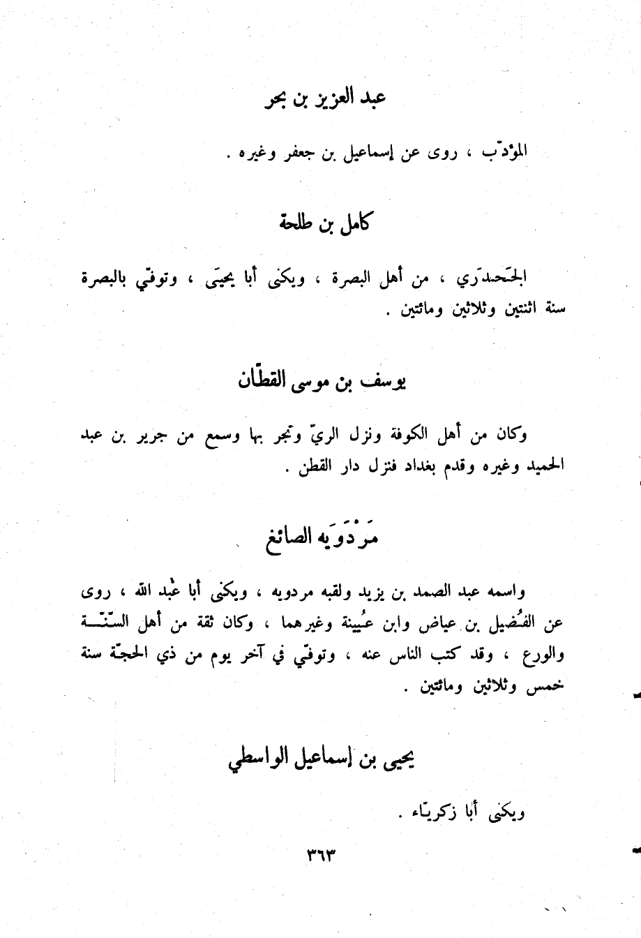 §عَبْدُ الْعَزِيزِ بْنُ بَحْرٍ الْمُؤَدِّبُ رَوَى عَنْ إِسْمَاعِيلَ بْنِ جَعْفَرٍ وَغَيْرِهِ