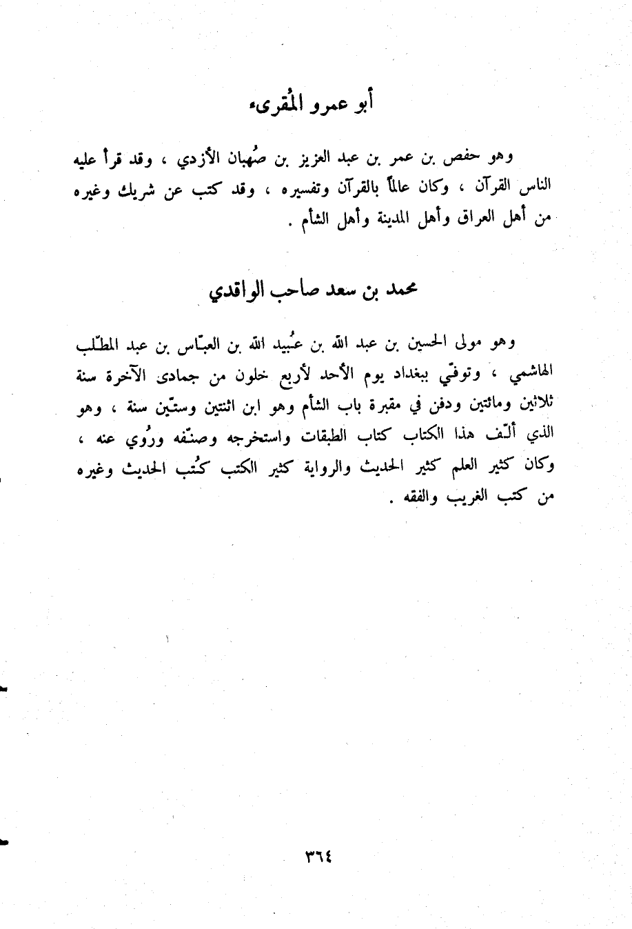 §مُحَمَّدُ بْنُ سَعْدٍ صَاحِبُ الْوَاقِدِيِّ، وَهُوَ مَوْلَى الْحُسَيْنِ بْنِ عَبْدِ اللَّهِ بْنِ عُبَيْدِ اللَّهِ بْنِ الْعَبَّاسِ بْنِ عَبْدِ الْمُطَّلِبِ الْهَاشِمِيِّ، وَتُوُفِّيَ بِبَغْدَادَ يَوْمَ الْأَحَدِ لِأَرْبَعٍ خَلَوْنَ مِنْ جُمَادَى الْآخِرَةِ سَنَةَ ثَلَاثِينَ وَمِائَتَيْنِ، وَدُفِنَ فِي مَقْبَرَةِ بَابِ الشَّامِ، وَهُوَ ابْنُ اثْنَتَيْنِ وَسِتِّينَ سَنَةً، وَهُوَ الَّذِي أَلَّفَ هَذَا الْكِتَابَ، كِتَابَ الطَّبَقَاتِ، وَاسْتَخْرَجَهُ وَصَنَّفَهُ وَرُوِيَ عَنْهُ، وَكَانَ كَثِيرَ الْعِلْمِ، كَثِيرَ الْحَدِيثِ وَالرِّوَايَةِ، كَثِيرَ الْكُتُبِ، كُتُبِ الْحَدِيثِ، وَغَيْرِهِ مِنْ كُتُبِ الْغَرِيبِ وَالْفِقْهِ