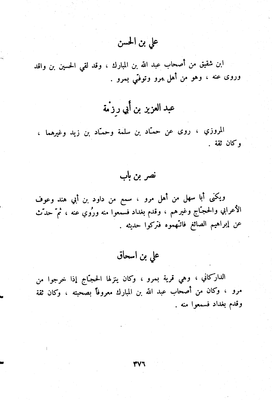 §عَلِيُّ بْنُ الْحَسَنِ بْنِ شَقِيقٍ مِنْ أَصْحَابِ عَبْدِ اللَّهِ بْنِ الْمُبَارَكِ، وَقَدْ لَقِيَ الْحُسَيْنَ بْنَ وَاقِدٍ وَرَوَى عَنْهُ، وَهُوَ مِنْ أَهْلِ مَرْوَ، وَتُوُفِّيَ بِمَرْوَ