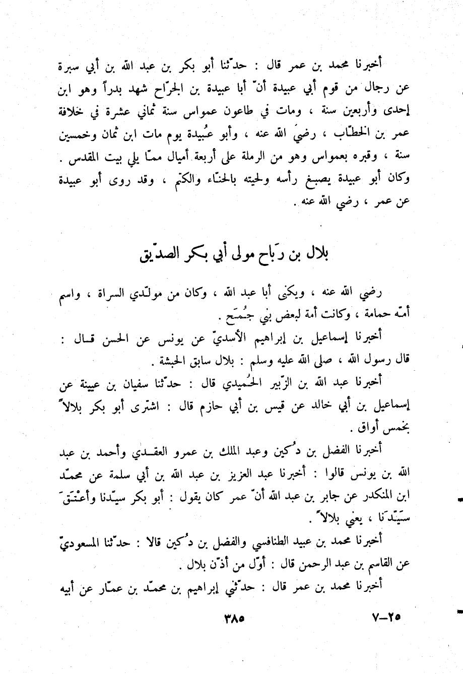 أَخْبَرَنَا مُحَمَّدُ بْنُ عُمَرَ قَالَ: حَدَّثَنَا أَبُو بَكْرِ بْنُ عَبْدِ اللَّهِ بْنِ أَبِي سَبْرَةَ، عَنْ رِجَالٍ مِنْ قَوْمِ أَبِي عُبَيْدَةَ: «§أَنَّ أَبَا عُبَيْدَةَ بْنَ الْجَرَّاحِ شَهِدَ بَدْرًا وَهُوَ ابْنُ إِحْدَى وَأَرْبَعِينَ سَنَةً» وَمَاتَ فِي طَاعُونِ عَمَوَاسَ سَنَةَ ثَمَانِيَ عَشْرَةَ فِي خِلَافَةِ عُمَرَ بْنِ الْخَطَّابِ رَضِيَ اللَّهُ عَنْهُ، وَأَبُو عُبَيْدَةَ يَوْمَ مَاتَ ابْنُ ثَمَانٍ وَخَمْسِينَ سَنَةً، وَقَبْرُهُ بِعَمَوَاسَ، وَهُوَ مِنَ الرَّمْلَةِ عَلَى أَرْبَعَةِ أَمْيَالٍ مِمَّا يَلِي بَيْتَ الْمَقْدِسِ، وَكَانَ أَبُو عُبَيْدَةَ يَصْبُغُ رَأْسَهُ وَلِحْيَتَهُ بِالْحِنَّاءِ وَالْكَتَمِ، وَقَدْ رَوَى أَبُو عُبَيْدَةَ عَنْ عُمَرَ رَضِيَ اللَّهُ عَنْهُ