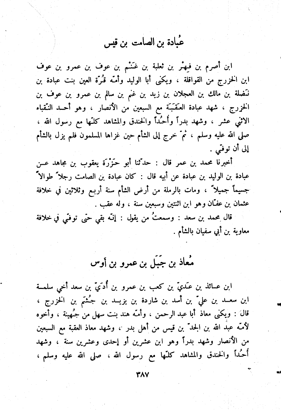 §مُعَاذُ بْنُ جَبَلِ بْنِ عَمْرِو بْنِ أَوْسِ بْنِ عَائِذِ بْنِ عَدِيِّ بْنِ كَعْبِ بْنِ عَمْرِو بْنِ أُدَيِّ بْنِ سَعْدٍ أَخِي سَلَمَةَ بْنِ سَعْدِ بْنِ عَلِيِّ بْنِ أَسَدِ بْنِ شَارِدَةَ بْنِ يَزِيدَ بْنِ جُشَمِ بْنِ الْخَزْرَجِ قَالَ: وَيُكْنَى مُعَاذٌ أَبَا عَبْدِ الرَّحْمَنِ، وَأُمُّهُ هِنْدُ بِنْتُ سَهْلٍ مِنْ جُهَيْنَةَ، وَأَخُوهُ لِأُمِّهِ عَبْدُ اللَّهِ بْنُ الْجَدِّ بْنِ قَيْسٍ مِنْ أَهْلِ بَدْرٍ، وَشَهِدَ مُعَاذٌ الْعَقَبَةَ مَعَ السَّبْعِينَ مِنَ الْأَنْصَارِ، وَشَهِدَ بَدْرًا وَهُوَ ابْنُ عِشْرِينَ أَوْ إِحْدَى وَعِشْرِينَ سَنَةً، وَشَهِدَ أُحُدًا، وَالْخَنْدَقَ، وَالْمَشَاهِدَ كُلَّهَا مَعَ رَسُولِ اللَّهِ صلّى الله عليه وسلم -[388]-، وَبَعَثَهُ رَسُولُ اللَّهِ صلّى الله عليه وسلم إِلَى الْيَمَنِ عَامِلًا وَمُعَلِّمًا، وَقُبِضَ رَسُولُ اللَّهِ صلّى الله عليه وسلم وَهُوَ بِالْيَمَنِ، وَاسْتُخْلِفَ أَبُو بَكْرٍ وَهُوَ عَلَيْهَا عَلَى الْجُنْدِ، ثُمَّ قَدِمَ مَكَّةَ، فَوَافَى عُمَرَ عَامَئِذٍ عَلَى الْحَجِّ