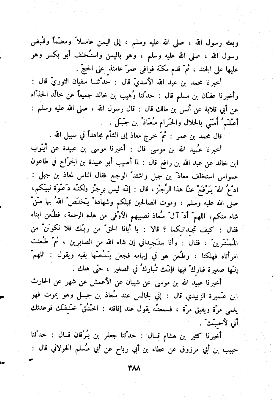 : أَخْبَرَنَا مُحَمَّدُ بْنُ عَبْدِ اللَّهِ الْأَسَدِيُّ قَالَ: حَدَّثَنَا سُفْيَانُ الثَّوْرِيُّ قَالَ: وَأَخْبَرَنَا عَفَّانُ بْنُ مُسْلِمٍ قَالَ: حَدَّثَنَا وُهَيْبُ بْنُ خَالِدٍ، جَمِيعًا عَنْ خَالِدٍ الْحَذَّاءِ، عَنْ أَبِي قِلَابَةَ، عَنْ أَنَسِ بْنِ مَالِكٍ قَالَ: قَالَ رَسُولُ اللَّهِ صلّى الله عليه وسلم: «§أَعْلَمُ أُمَّتِي بِالْحَلَالِ وَالْحَرَامِ مُعَاذُ بْنُ جَبَلٍ» قَالَ مُحَمَّدُ بْنُ عُمَرَ: ثُمَّ خَرَجَ مُعَاذٌ إِلَى الشَّامِ مُجَاهِدًا فِي سَبِيلِ اللَّهِ