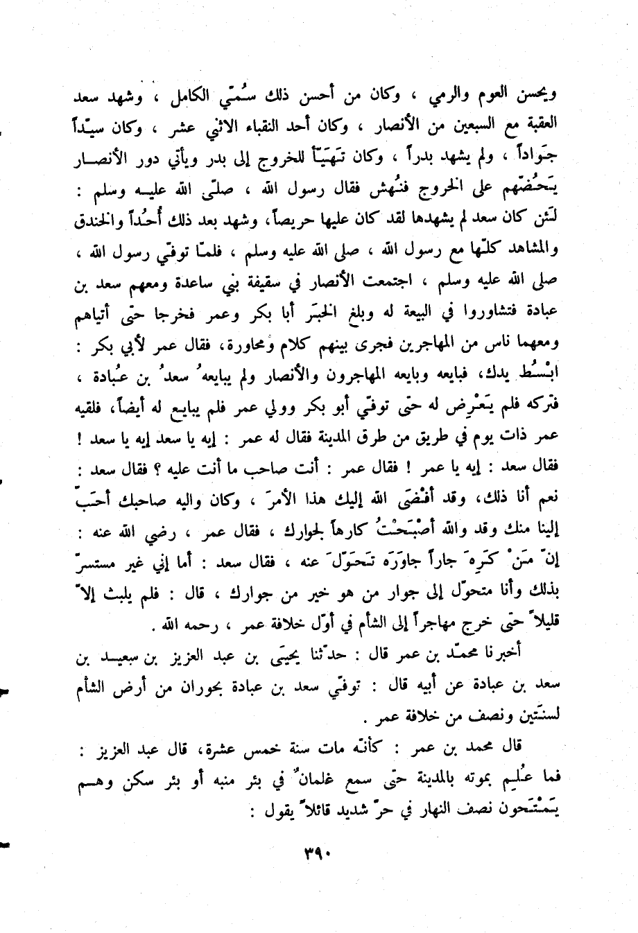 ، وَيُحْسِنُ الْعَوْمَ وَالرَّمْيَ، وَكَانَ مَنْ أَحْسَنَ ذَلِكَ سُمِّيَ الْكَامِلَ، وَشَهِدَ سَعْدٌ الْعَقَبَةَ مَعَ السَّبْعِينَ مِنَ الْأَنْصَارِ، وَكَانَ أَحَدَ النُّقَبَاءِ الِاثْنَيْ عَشَرَ، وَكَانَ سَيِّدَا جَوَّادًا، وَلَمْ يَشْهَدْ بَدْرًا، وَكَانَ تَهَيَّأَ لِلْخُرُوجِ إِلَى بَدْرٍ، وَيَأْتِي دُورَ الْأَنْصَارِ يَحُضُّهُمْ عَلَى الْخُرُوجِ، فَنُهِشَ، فَقَالَ رَسُولُ اللَّهِ صلّى الله عليه وسلم: «لَئِنْ كَانَ سَعْدٌ لَمْ يَشْهَدْهَا لَقَدْ كَانَ عَلَيْهَا حَرِيصًا» وَشَهِدَ بَعْدَ ذَلِكَ أُحُدًا، وَالْخَنْدَقَ، وَالْمَشَاهِدَ كُلَّهَا مَعَ رَسُولِ اللَّهِ صلّى الله عليه وسلم، فَلَمَّا تُوُفِّيَ رَسُولُ اللَّهِ صلّى الله عليه وسلم اجْتَمَعَتِ الْأَنْصَارُ فِي سَقِيفَةِ بَنِي سَاعِدَةَ وَمَعَهُمْ سَعْدُ بْنُ عُبَادَةَ، فَتَشَاوَرُوا فِي الْبَيْعَةِ لَهُ، وَبَلَغَ الْخَبَرُ أَبَا بَكْرٍ وَعُمَرَ، فَخَرَجَا حَتَّى أَتَيَاهُمْ وَمَعَهُمَا نَاسٌ مِنَ الْمُهَاجِرِينِ، فَجَرَى بَيْنَهُمْ كَلَامٌ وَمُحَاوَرَةٌ، فَقَالَ عُمَرُ لِأَبِي بَكْرٍ: ابْسُطْ يَدَكَ فَبَايَعَهُ، وَبَايَعَهُ الْمُهَاجِرُونَ وَالْأَنْصَارُ، وَلَمْ يُبَايِعْهُ سَعْدُ بْنُ عُبَادَةَ، فَتَرَكَهُ فَلَمْ يَعْرِضْ لَهُ حَتَّى تُوُفِّيَ أَبُو بَكْرٍ، وَوَلِيَ عُمَرُ، فَلَمْ يُبَايِعْ لَهُ أَيْضًا، فَلَقِيَهُ عُمَرُ ذَاتَ يَوْمٍ فِي طَرِيقٍ مِنْ طُرُقِ الْمَدِينَةِ، فَقَالَ لَهُ عُمَرُ: إِيهِ يَا سَعْدُ، إِيهِ يَا سَعْدُ فَقَالَ سَعْدٌ: إِيهِ يَا عُمَرُ فَقَالَ عُمَرُ: أَنْتَ صَاحِبُ مَا أَنْتَ عَلَيْهِ فَقَالَ سَعْدٌ: نَعَمْ، أَنَا ذَلِكَ، وَقَدْ أَفْضَى اللَّهُ إِلَيْكَ هَذَا الْأَمْرَ، وَكَانَ وَالِيهِ صَاحِبُكَ أَحَبَّ إِلَيْنَا مِنْكَ، وَقَدْ وَاللَّهِ أَصْبَحْتُ كَارِهًا لِجِوَارِكَ فَقَالَ عُمَرُ رَضِيَ اللَّهُ عَنْهُ: إِنَّ مَنْ كَرِهَ جَارًا جَاوَرَهُ تَحَوَّلَ عَنْهُ فَقَالَ سَعْدٌ: أَمَا إِنِّي غَيْرُ مُسْتَسِرٍّ بِذَلِكَ، وَأَنَا مُتَحَوِّلٌ إِلَى جِوَارِ مَنْ هُوَ خَيْرٌ مِنْ جِوَارِكَ قَالَ: فَلَمْ يَلْبَثْ إِلَّا قَلِيلًا حَتَّى خَرَجَ مُهَاجِرًا إِلَى الشَّامِ، فِي أَوَّلِ خِلَافَةِ عُمَرَ رَحِمَهُ اللَّهُ