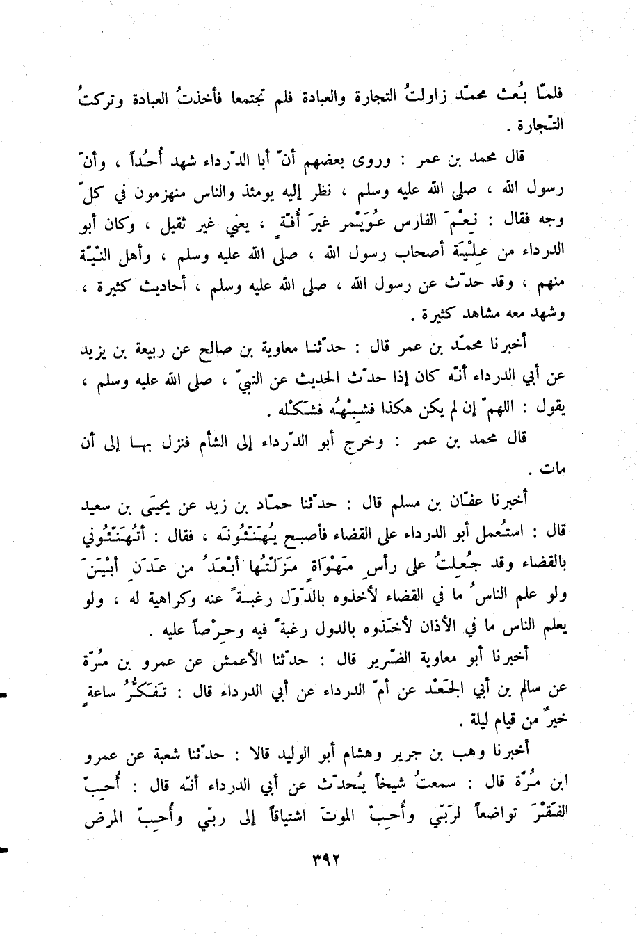 أَخْبَرَنَا أَبُو مُعَاوِيَةَ الضَّرِيرُ قَالَ: حَدَّثَنَا الْأَعْمَشُ، عَنْ عَمْرِو بْنِ مُرَّةَ، عَنْ سَالِمِ بْنِ أَبِي الْجَعْدِ، عَنْ أُمِّ الدَّرْدَاءِ، عَنْ أَبِي الدَّرْدَاءِ قَالَ: «§تَفَكُّرُ سَاعَةٍ خَيْرٌ مِنْ قِيَامِ لَيْلَةٍ»