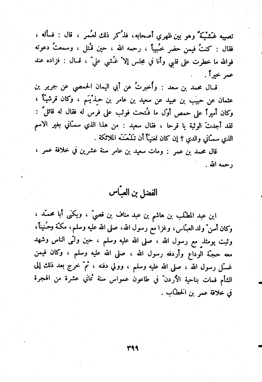 §الْفَضْلُ بْنُ الْعَبَّاسِ بْنِ عَبْدِ الْمُطَّلِبِ بْنِ هَاشِمِ بْنِ عَبْدِ مَنَافِ بْنِ قُصَيٍّ، وَيُكْنَى أَبَا مُحَمَّدٍ، وَكَانَ أَسَنَّ وَلَدِ الْعَبَّاسِ، وَغَزَا مَعَ رَسُولِ اللَّهِ صلّى الله عليه وسلم مَكَّةَ وَحُنَيْنًا، وَثَبَتَ يَوْمَئِذٍ مَعَ رَسُولِ اللَّهِ صلّى الله عليه وسلم حِينَ وَلَّى النَّاسُ، وَشَهِدَ مَعَهُ حَجَّةَ الْوَدَاعِ، وَأَرْدَفَهُ رَسُولُ اللَّهِ صلّى الله عليه وسلم، وَكَانَ فِيمَنْ غَسَّلَ رَسُولَ اللَّهِ صلّى الله عليه وسلم، وَوَلِيَ دَفْنَهُ، ثُمَّ خَرَجَ بَعْدَ ذَلِكَ إِلَى الشَّامِ، فَمَاتَ بِنَاحِيَةِ الْأُرْدُنِّ فِي طَاعُونِ عَمَوَاسَ سَنَةَ ثَمَانِيَ عَشْرَةَ مِنَ الْهِجْرَةِ، فِي خِلَافَةِ عُمَرَ بْنِ الْخَطَّابِ
