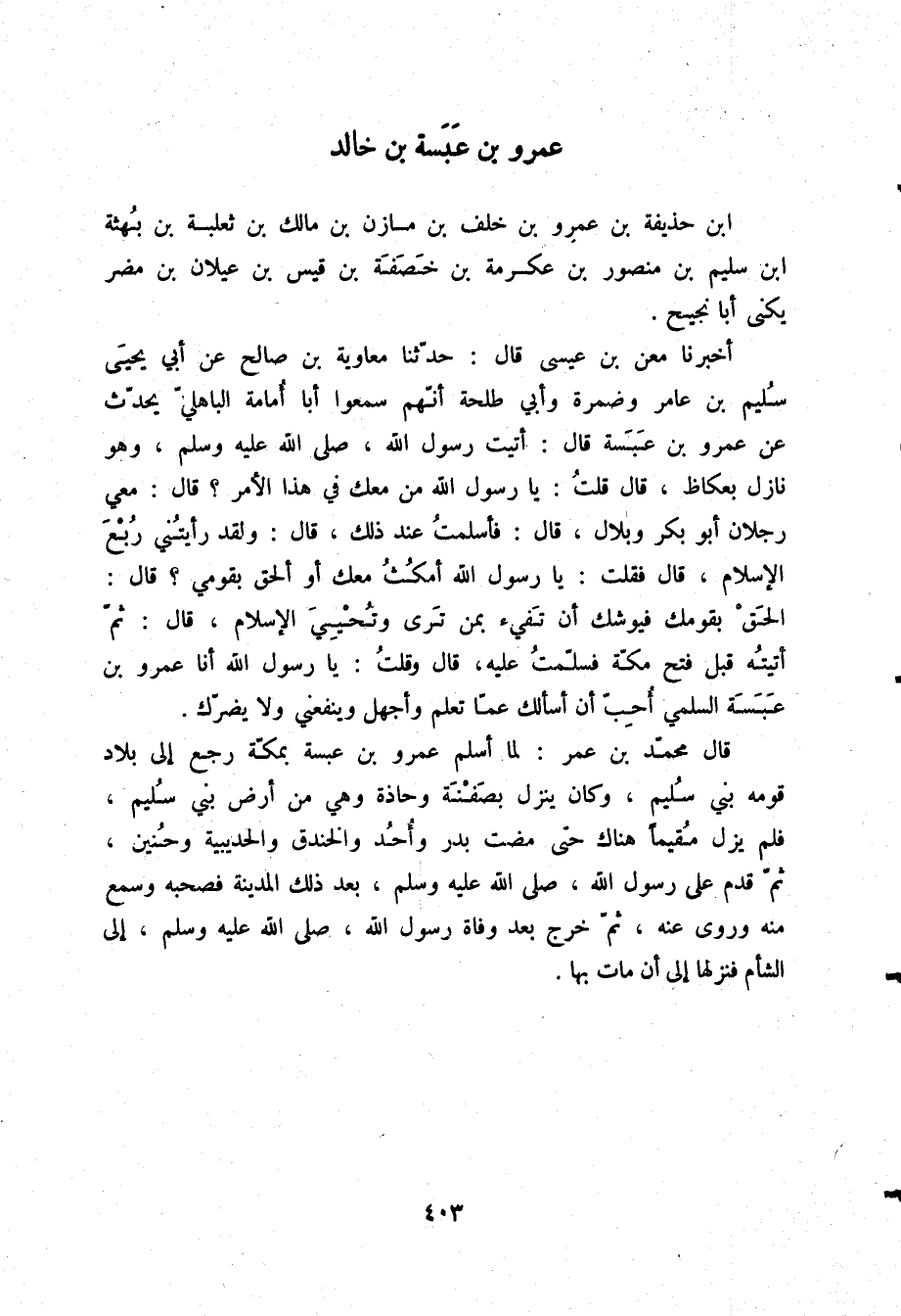 §عَمْرُو بْنُ عَبَسَةَ بْنِ خَالِدِ بْنِ حُذَيْفَةَ بْنِ عَمْرِو بْنِ خَلَفِ بْنِ مَازِنِ بْنِ مَالِكِ بْنِ ثَعْلَبَةَ بْنِ بُهْثَةَ بْنِ سُلَيْمِ بْنِ مَنْصُورِ بْنِ عِكْرِمَةَ بْنِ خَصَفَةَ بْنِ قَيْسِ بْنِ عَيْلَانَ بْنِ مُضَرَ، يُكْنَى أَبَا نَجِيحٍ