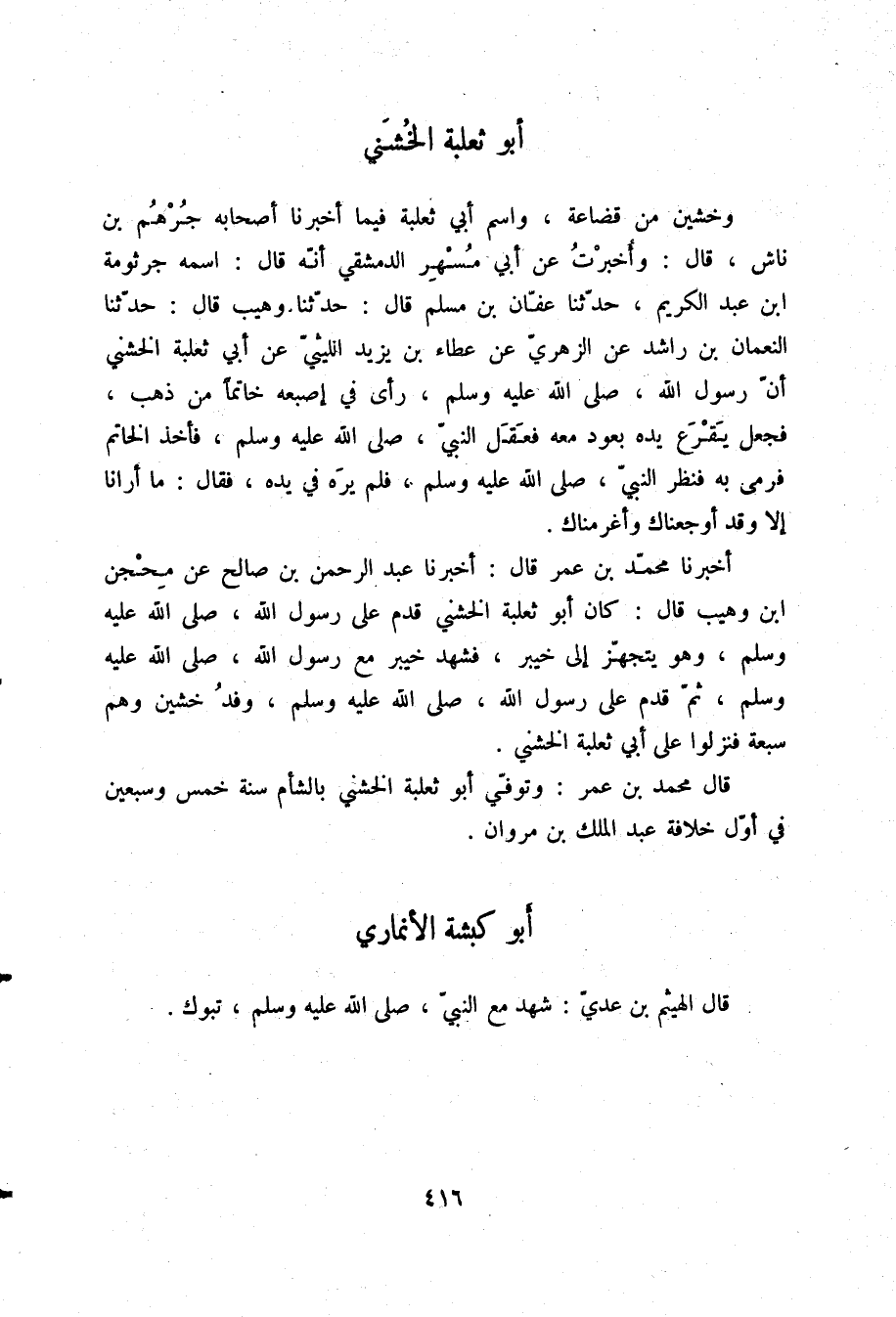§أَبُو ثَعْلَبَةَ الْخُشَنِيُّ وَخُشَيْنٌ مِنْ قُضَاعَةَ، وَاسْمُ أَبِي ثَعْلَبَةَ فِيمَا أَخْبَرَنَا أَصْحَابُهُ: جُرْهُمُ بْنُ نَاشٍ، قَالَ: وَأُخْبِرْتُ عَنْ أَبِي مُسْهِرٍ الدِّمَشْقِيِّ، أَنَّهُ قَالَ: «اسْمُهُ جُرْثُومَةُ بْنُ عَبْدِ الْكَرِيمِ»