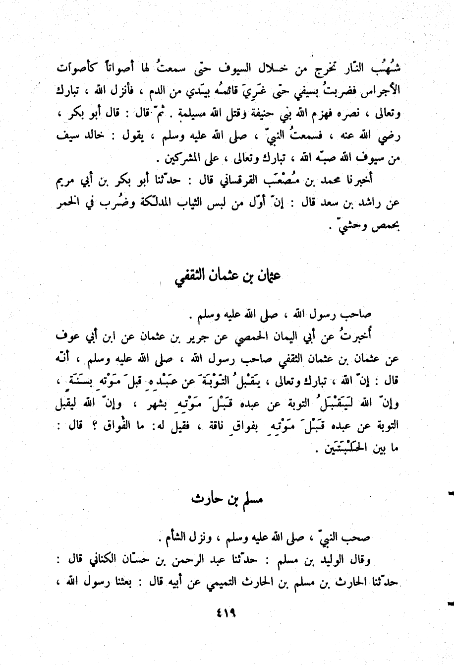 وَقَالَ الْوَلِيدُ بْنُ مُسْلِمٍ: حَدَّثَنَا عَبْدُ الرَّحْمَنِ بْنُ حَسَّانَ الْكِنَانِيُّ قَالَ: حَدَّثَنَا الْحَارِثُ بْنُ مُسْلِمِ بْنِ الْحَارِثِ التَّمِيمِيُّ، عَنْ أَبِيهِ قَالَ: بَعَثَنَا رَسُولُ اللَّهِ -[420]- صلّى الله عليه وسلم فِي سَرِيَّةٍ، فَلَمَّا دَنَوْنَا مِنَ الْحِصْنِ سَمِعْنَا ضَوْضَاءَ أَهْلِهِ، فَاسْتَحْثَثْتُ فَرَسِي، فَأَتَيْتُهُمْ، فَقُلْتُ: قُولُوا: لَا إِلَهَ إِلَّا اللَّهُ تَحْتَرِزُوا، فَقَالُوا: لَا إِلَهَ إِلَّا اللَّهُ، فَقَالَ أَصْحَابُنَا: حَرَمْتَنَا الْغَنِيمَةَ بَعْدَ أَنْ بَرَدَتْ فِي أَيْدِينَا فَلَمَّا قَدِمْنَا عَلَى رَسُولِ اللَّهِ صلّى الله عليه وسلم أُخْبِرَ بِذَلِكَ، فَحَسَّنَ لِي مَا صَنَعْتُ، وَقَالَ لِي: «إِنَّ لَكَ مِنَ الْأَجْرِ بِعَدَدِ كُلِّ إِنْسَانٍ مِنْهُمْ كَذَا وَكَذَا» ، ثُمَّ قَالَ: «§أَكْتُبُ لَكَ كِتَابًا أُوصِي بِكَ أَئِمَّةَ الْمُسْلِمِينَ بَعْدِي» ، قَالَ: فَكَتَبَ لِي كِتَابًا وَخَتَمَهُ، فَلَمَّا قُبِضَ النَّبِيُّ صلّى الله عليه وسلم أَتَيْتُ أَبَا بَكْرٍ بِالْكِتَابِ، فَفَضَّهُ، وَأَعْطَانِي شَيْئًا، ثُمَّ خَتَمَهُ، فَلَمَّا قُبِضَ أَبُو بَكْرٍ أَتَيْتُ عُمَرَ بْنَ الْخَطَّابِ بِالْكِتَابِ، فَفَضَّهُ، وَأَعْطَانِي شَيْئًا، ثُمَّ خَتَمَهُ، فَلَمَّا اسْتُخْلِفَ عُثْمَانُ أَتَيْتُهُ بِالْكِتَابِ فَفَضَّهُ وَقَرَأَهُ فَأَعْطَانِي شَيْئًا ثُمَّ خَتَمَهُ فَلَمَّا اسْتُخْلِفَ عُمَرُ بْنُ عَبْدِ الْعَزِيزِ بَعَثَ إِلَى الْحَارِثِ بْنِ مُسْلِمٍ فَأَتَاهُ، فَأَعْطَاهُ شَيْئًا، وَقَالَ: لَوْ أَرَدْتُ لَوَصَلْتُ إِلَيْكَ، وَلَكِنِّي أَرَدْت أَنْ تُحَدِّثَنِي بِحَدِيثِكَ، عَنْ أَبِيكَ، عَنِ النَّبِيِّ صلّى الله عليه وسلم، فَحَدَّثْتُهُ بِهِ