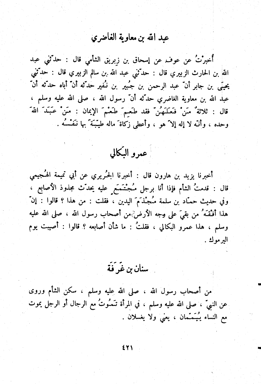 أُخْبِرْتُ عَنْ عَوْفٍ، عَنْ إِسْحَاقَ بْنِ زِبْرِيقٍ الشَّامِيِّ، قَالَ: حَدَّثَنِي عَبْدُ اللَّهِ بْنُ الْحَارِثِ الزُّبَيْدِيُّ، قَالَ: حَدَّثَنِي عَبْدُ اللَّهِ بْنُ سَالِمٍ الزُّبَيْدِيُّ، قَالَ: حَدَّثَنِي يَحْيَى بْنُ جَابِرٍ، أَنَّ عَبْدَ الرَّحْمَنِ بْنَ جُبَيْرِ بْنِ نُفَيْرٍ، حَدَّثَهُ أَنَّ أَبَاهُ حَدَّثَهُ أَنَّ عَبْدَ اللَّهِ بْنَ مُعَاوِيَةَ الْغَاضِرِيَّ حَدَّثَهُ أَنَّ رَسُولَ اللَّهِ صلّى الله عليه وسلم قَالَ: " §ثَلَاثَةٌ مَنْ فَعَلَهُنَّ فَقَدْ طَعِمَ طَعْمَ الْإِيمَانِ: مَنْ عَبَدَ اللَّهَ وَحْدَهُ، وَأَنَّهُ لَا إِلَهَ إِلَّا هُوَ، وَأَعْطَى زَكَاةَ مَالِهِ طَيِّبَةً بِهَا نَفْسُهُ "