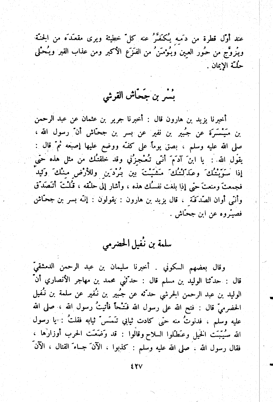 أَخْبَرَنَا يَزِيدُ بْنُ هَارُونَ، قَالَ: أَخْبَرَنَا حَرِيزُ بْنُ عُثْمَانَ، عَنْ عَبْدِ الرَّحْمَنِ بْنِ مَيْسَرَةَ، عَنْ جُبَيْرِ بْنِ نُفَيْرٍ، عَنْ بُسْرِ بْنِ جَحَّاشٍ، أَنَّ رَسُولَ اللَّهِ صلّى الله عليه وسلم بَصَقَ يَوْمًا عَلَى كَفِّهِ، وَوَضَعَ عَلَيْهَا إِصْبَعَهُ، ثُمَّ قَالَ: " §يَقُولُ اللَّهُ: يَا ابْنَ آدَمَ، أَنَّى تُعْجِزُنِي، وَقَدْ خَلَقْتُكَ مِنْ مِثْلِ هَذِهِ، حَتَّى إِذَا سَوَّيْتُكَ وَعَدَلْتُكَ مَشَيْتَ بَيْنَ بُرْدَيْنِ وَلِلْأَرْضِ مِنْكَ وَئِيدٌ، فَجَمَعْتَ وَمَنَعْتَ، حَتَّى إِذَا بَلَغَتْ نَفْسُكَ هَذِهِ - وَأَشَارَ إِلَى حَلْقِهِ - قُلْتَ أَتَصَدَّقُ، وَأَنَّى أَوَانُ الصَّدَقَةِ " قَالَ يَزِيدُ بْنُ هَارُونَ: يَقُولُونَ: إِنَّهُ بُسْرُ بْنُ جَحَّاشٍ، فَصَيَّرُوهُ عَنِ ابْنِ جَحَّاشٍ