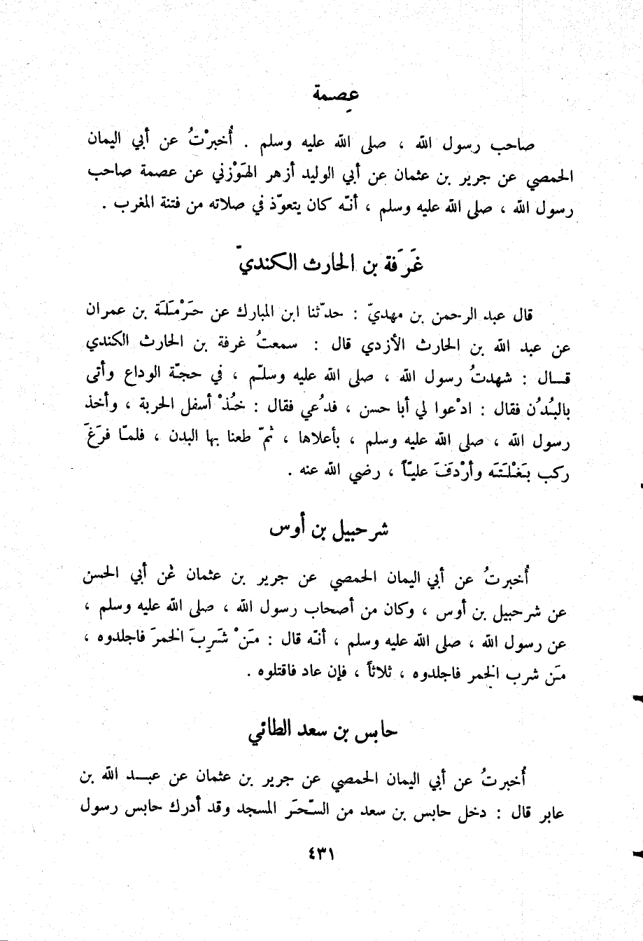 أُخْبِرْتُ عَنْ أَبِي الْيَمَانِ الْحِمْصِيِّ، عَنْ جَرِيرِ بْنِ عُثْمَانَ، عَنْ أَبِي الْوَلِيدِ أَزْهَرَ الْهَوْزَنِيِّ، عَنْ عِصْمَةَ صَاحِبِ رَسُولِ اللَّهِ صلّى الله عليه وسلم «أَنَّهُ §كَانَ يَتَعَوَّذُ فِي صَلَاتِهِ مِنْ فِتْنَةِ الْمَغْرِبِ»